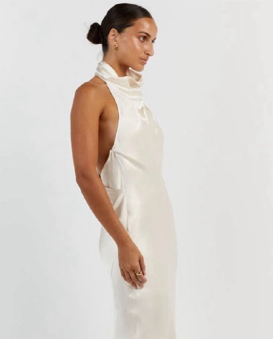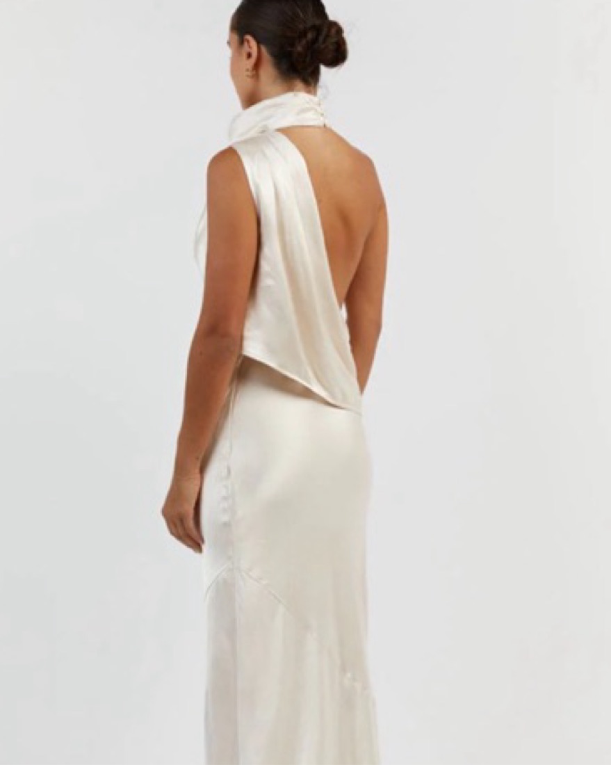 This dress has not yet been worn! It’s made from a beautiful pearly fabric, drapes across the front with a partially open back. It reaches my ankles (I’m 5’8”). Happy to provide measurement info!