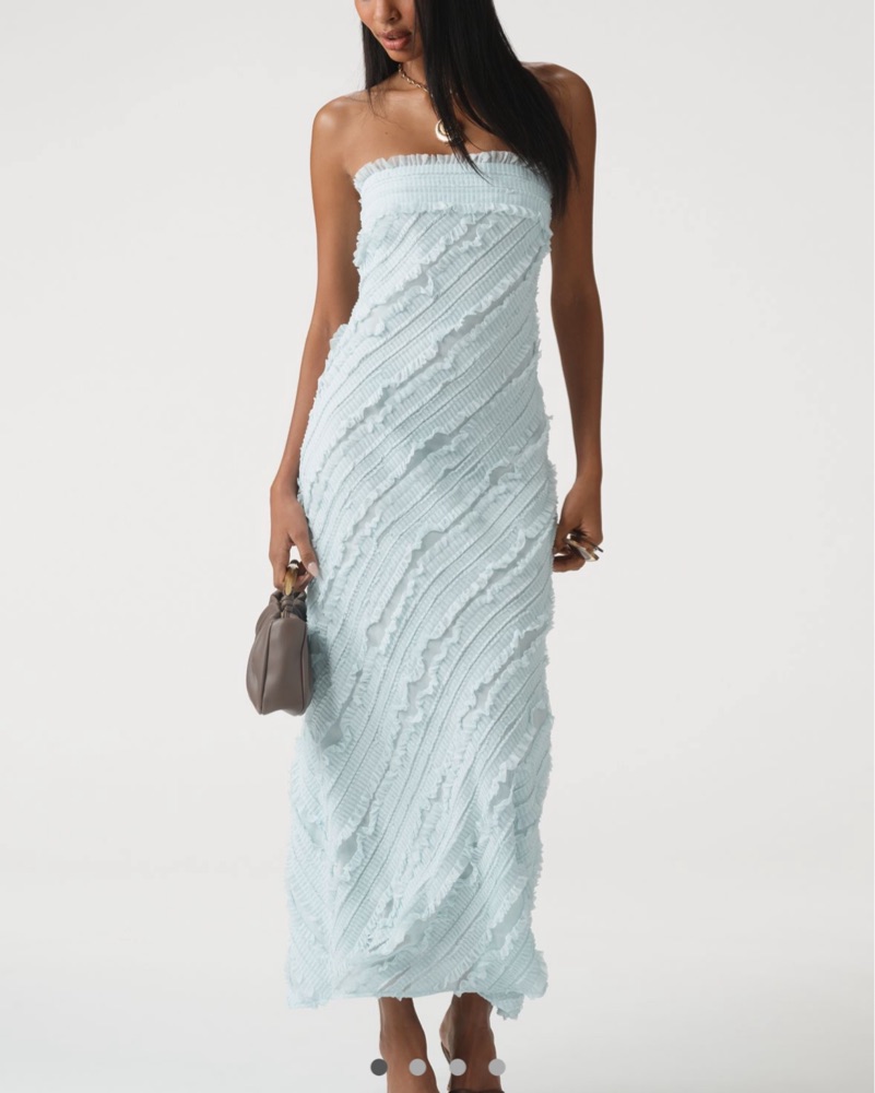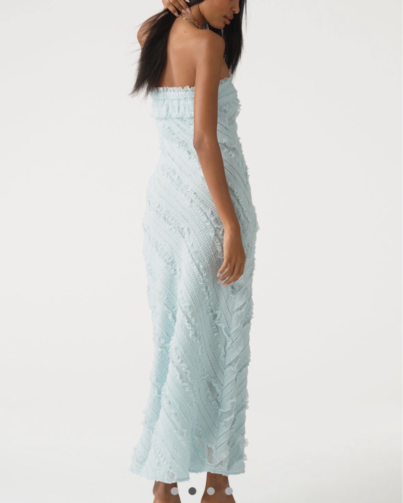 Baby blue ruffle strapless maxi dress. In great condition, worn once.