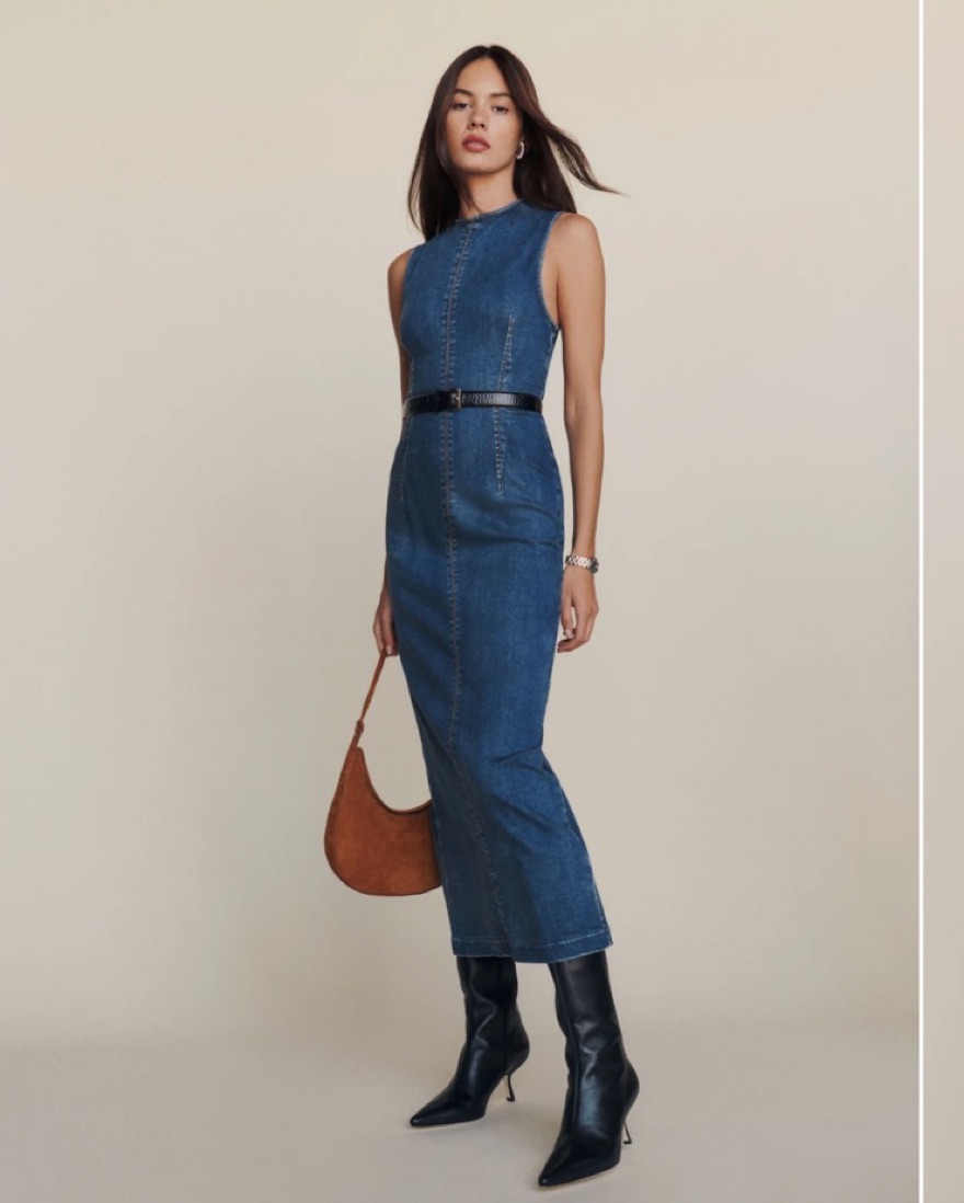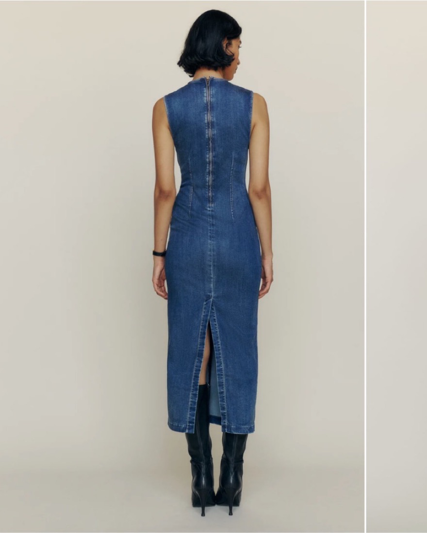 Denim midi dress - true to size. Slit in back. Would fit a 0-2. Perfect for holiday work parties or Easter brunch.