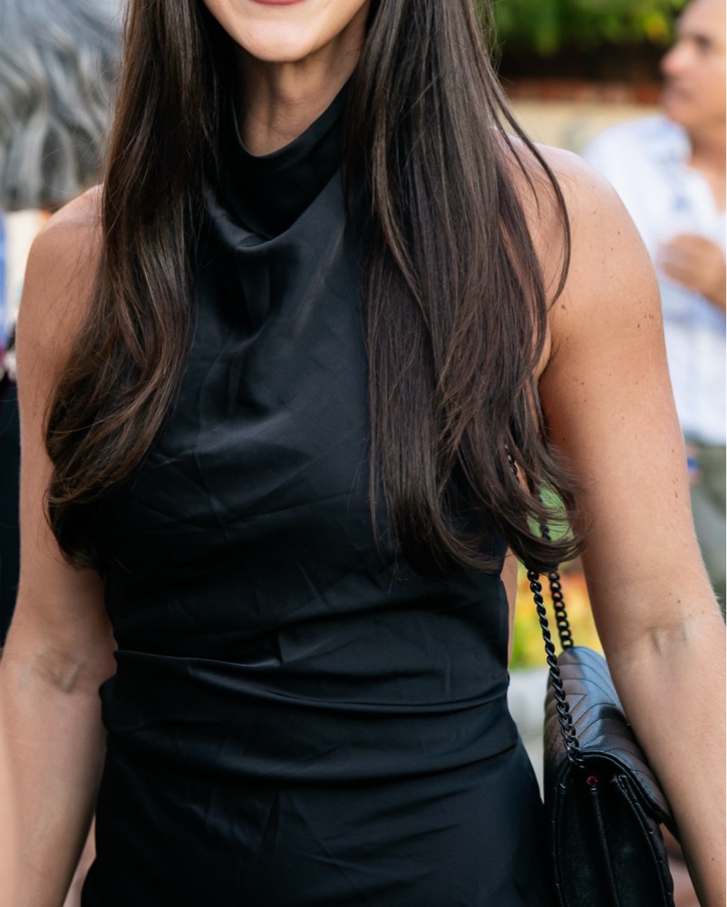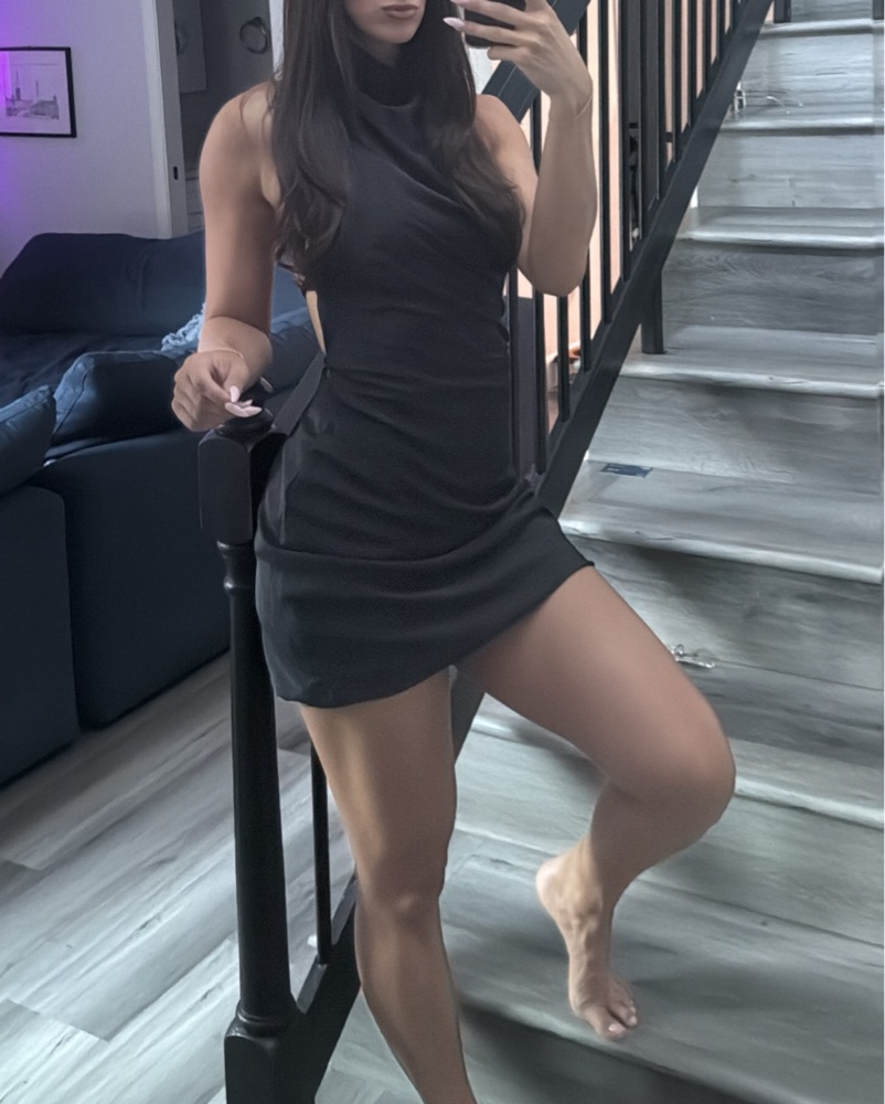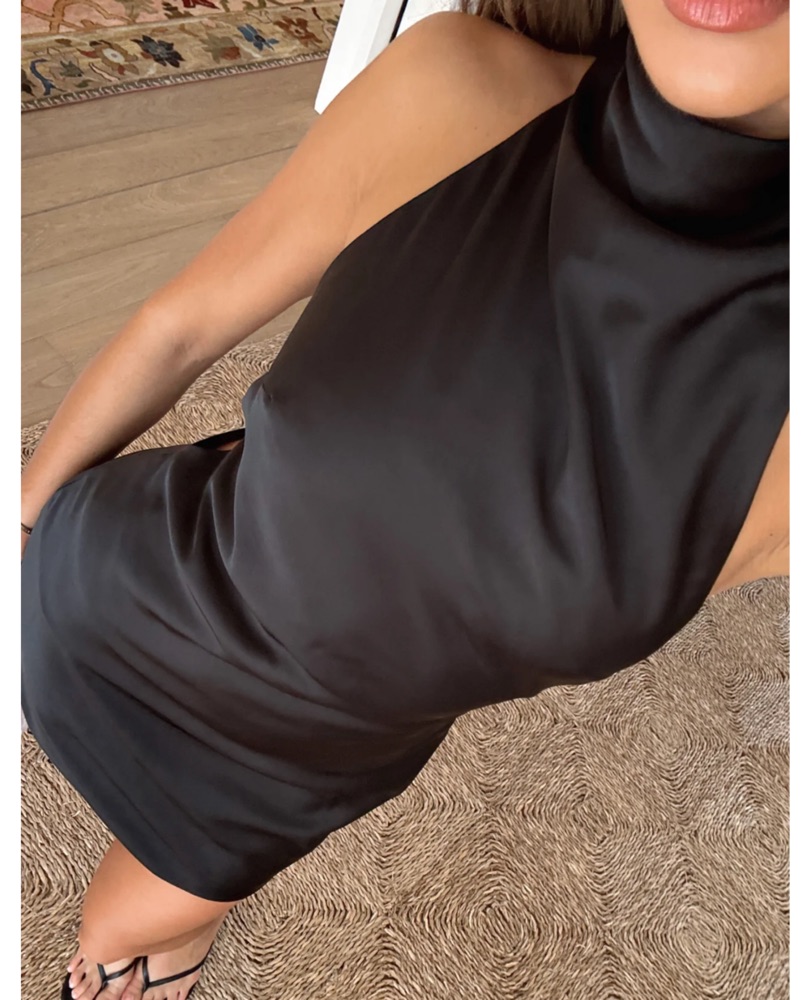 Satin halter backless mini dress. I’m 5’6” and it didn’t feel too short on me at all.