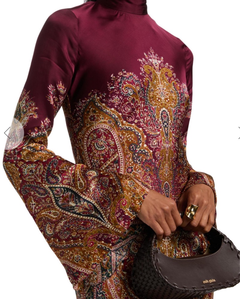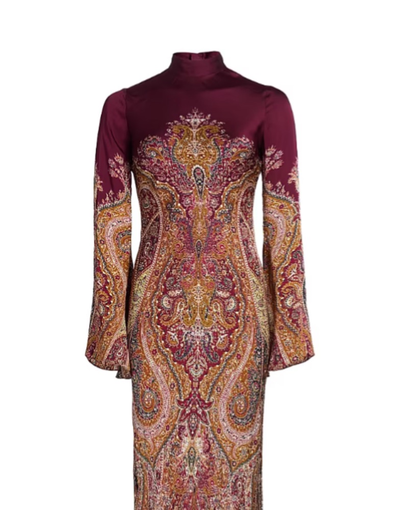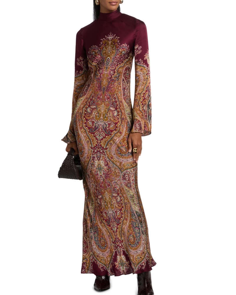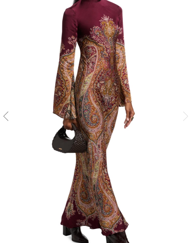 Maxi Burgundy and Paisley Silk Long Sleeve Dress - xs