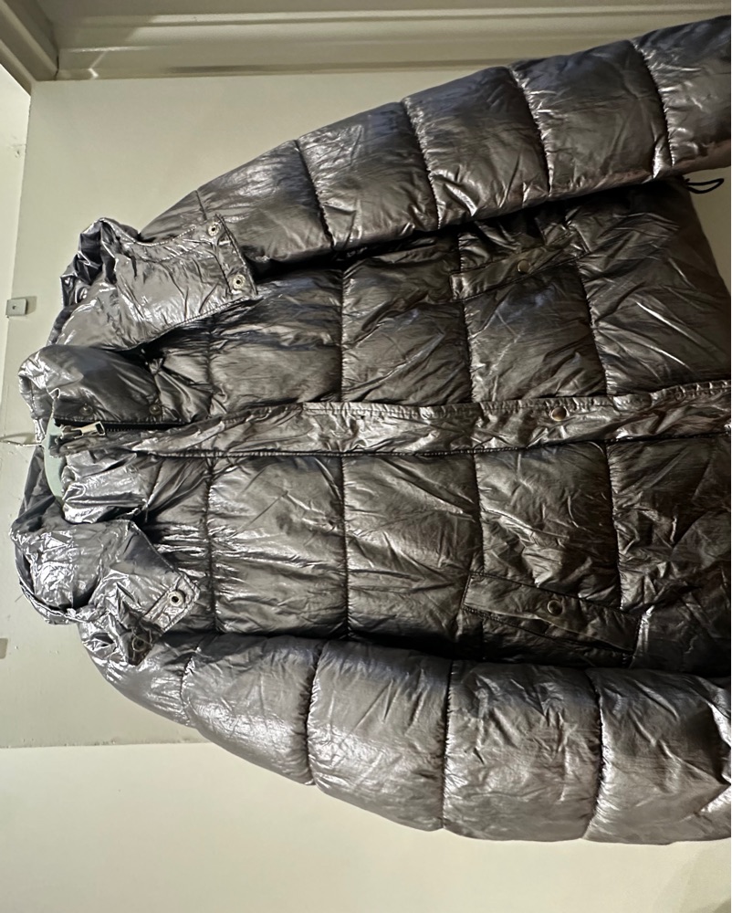 Silver puffer jacket with a detachable hood. Lightweight but great for cool winter days.