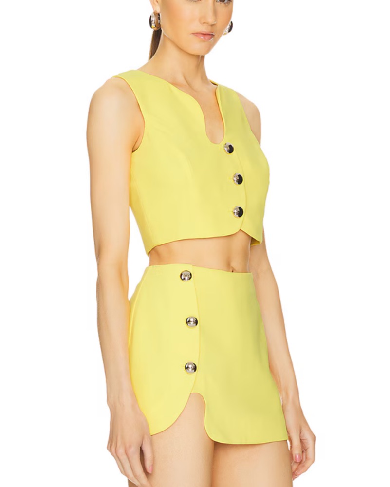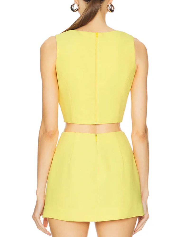 This vibrant yellow crop top and matching mini skirt set is perfect for a fun, flirty night out.
