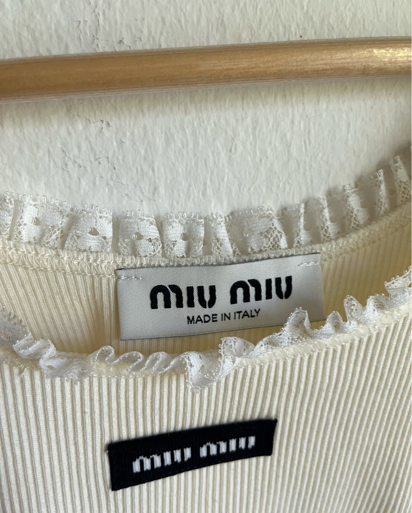 ribbed miu miu tank top with lace details. size small. care tag removed but can be seen in photos. please do not wash ☁️