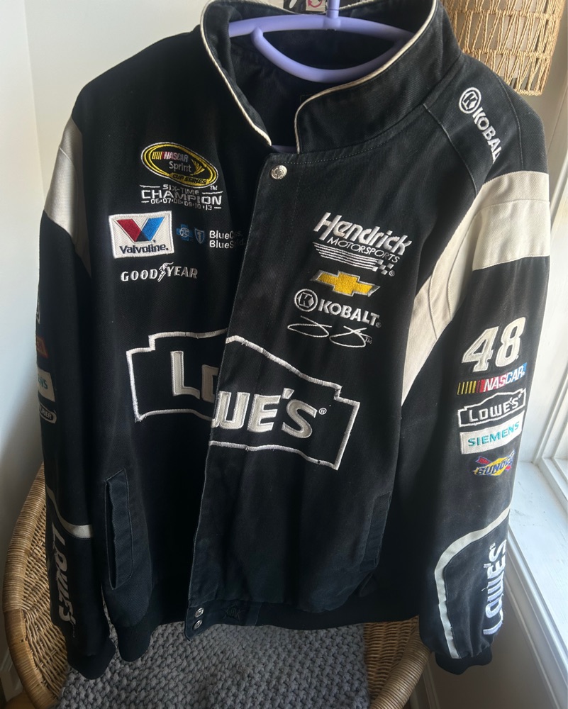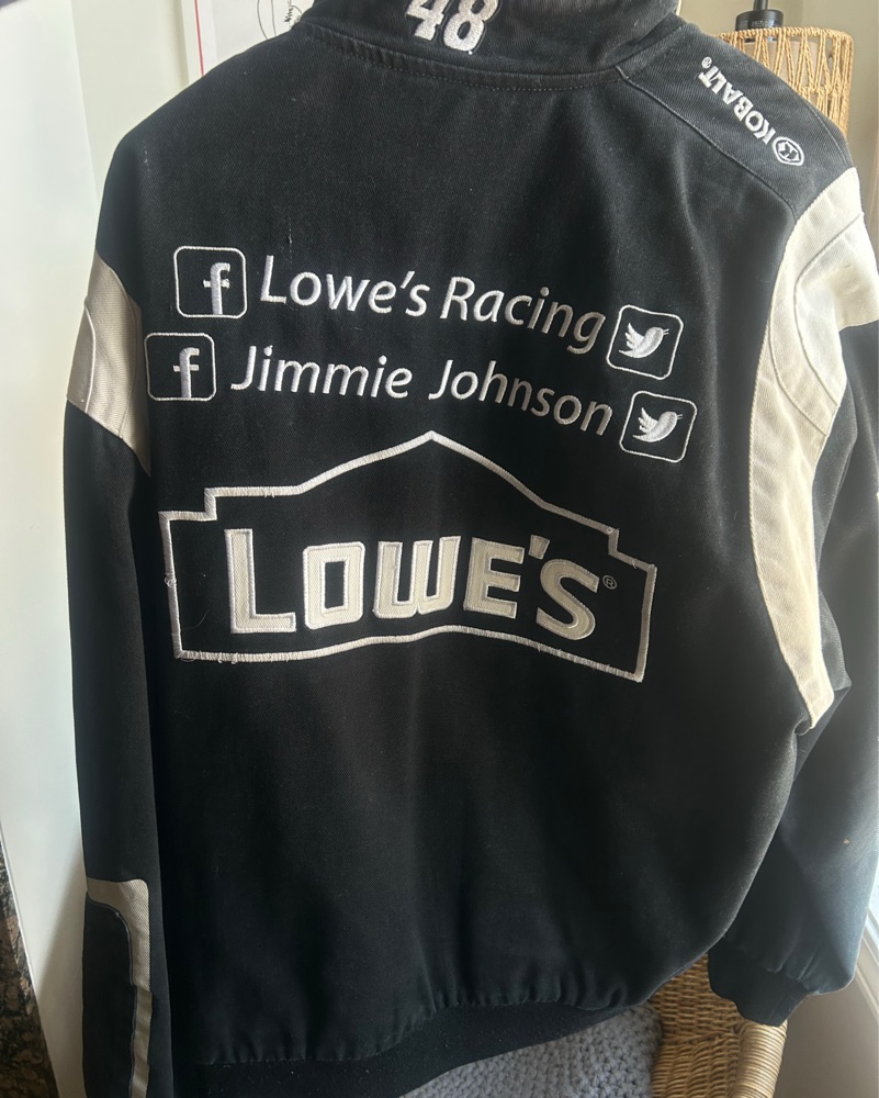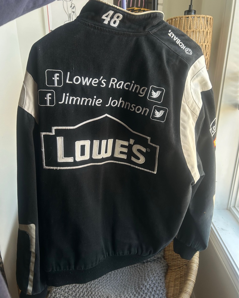 eye-catching Nascar race jacket by Lowe's. Get so many compliments whenever I wear either of my NASCAR jackets! Pair with some cute black micro shorts