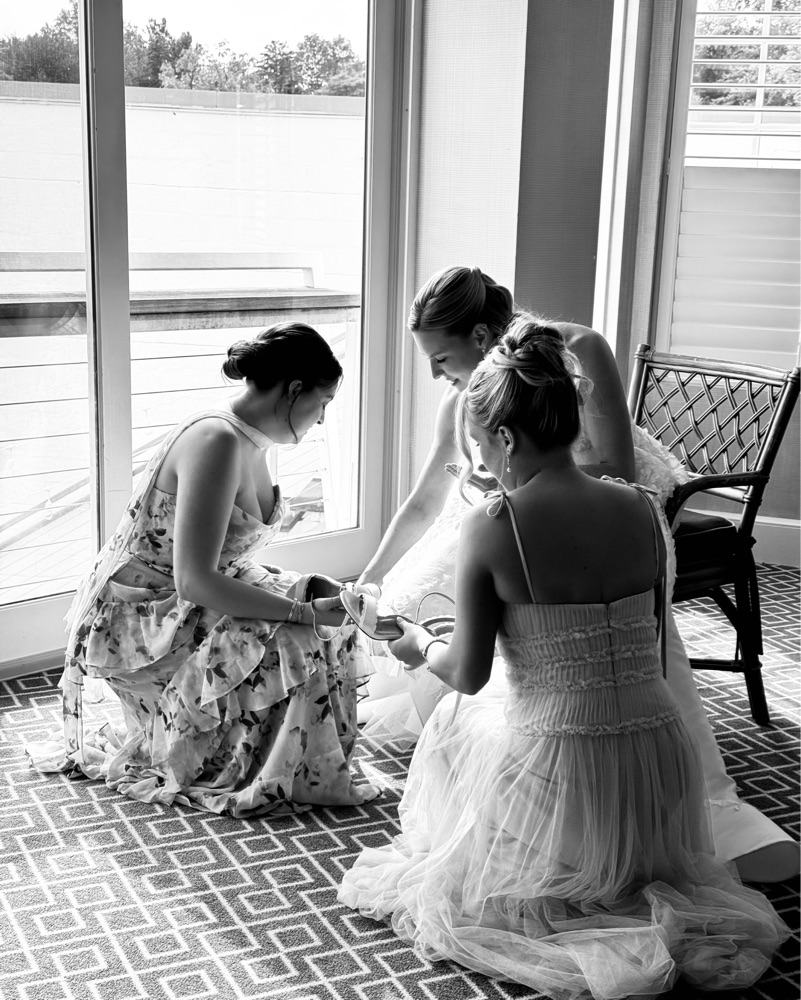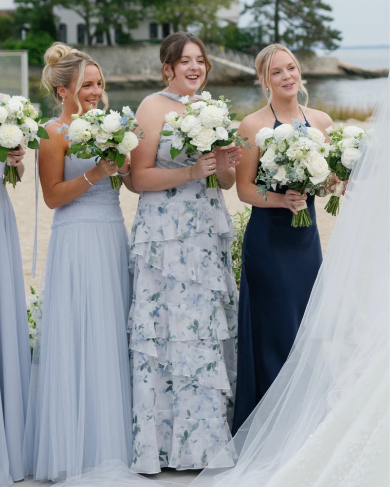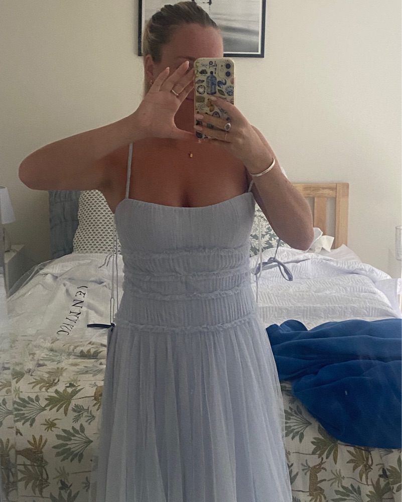 Light blue tulle Jenny yoo dress! I hemmed this to be floor length (I’m 5’2 and wore 3 inch heels). Straps are adjustable to any length.