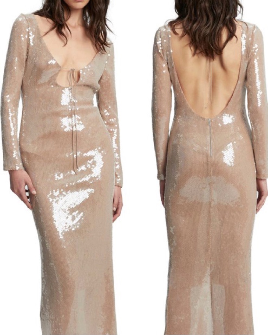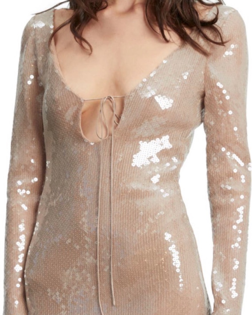 From Bardot, this dress features: Sequin fabrication Scoop tie neckline Long sleeves Low scoop back Lined Zip back closure Approx. 51.2" length