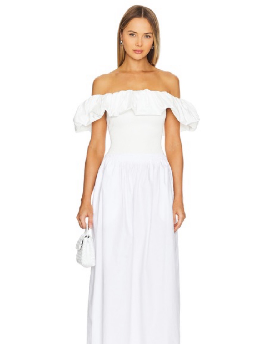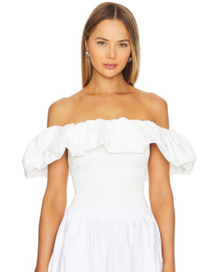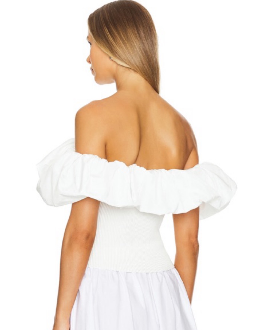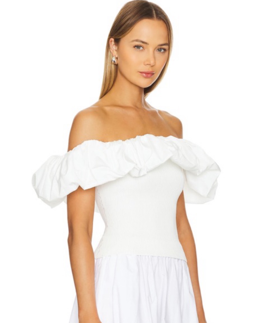 Cherie Top from ASTR the Label. White off the shoulder top with knit fabric at bodice. Please no self tanner!