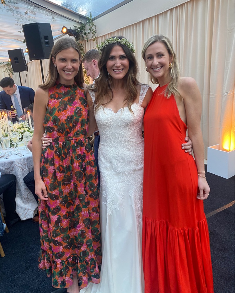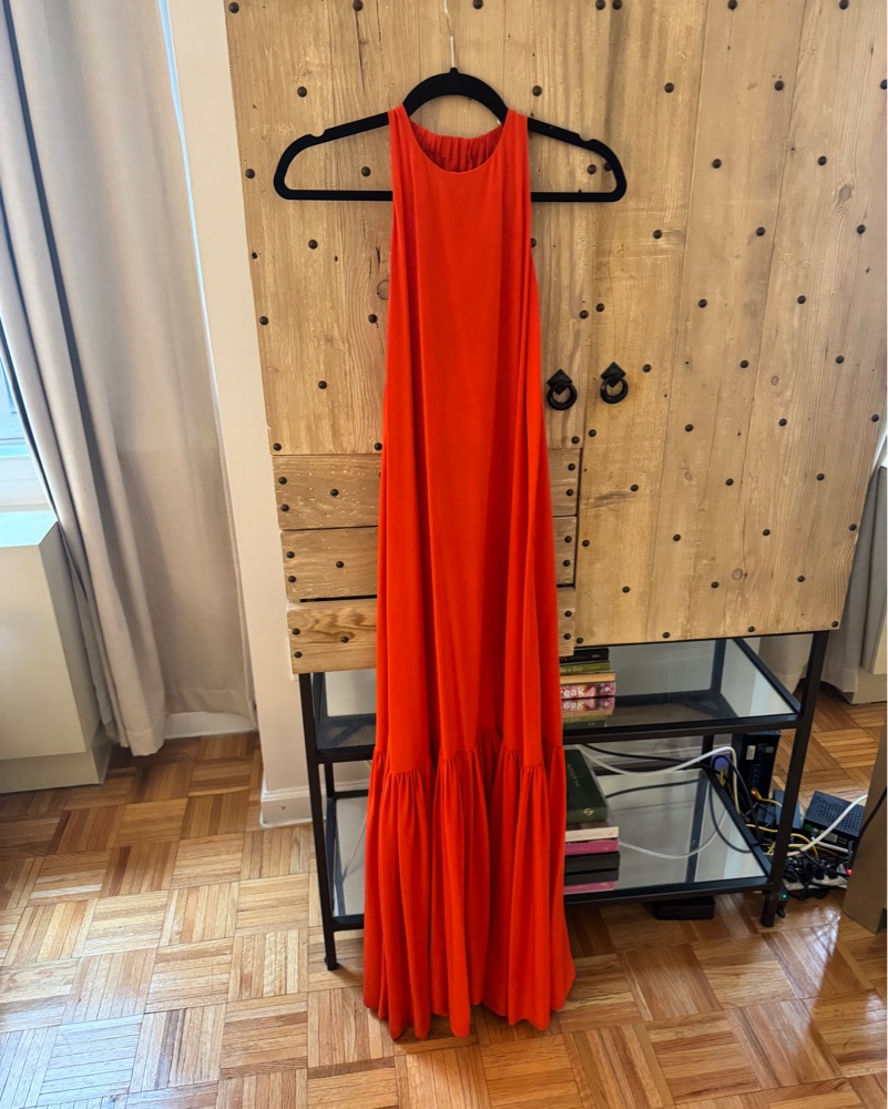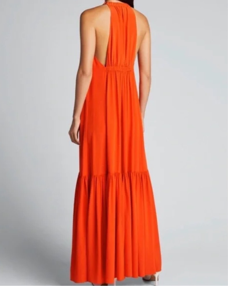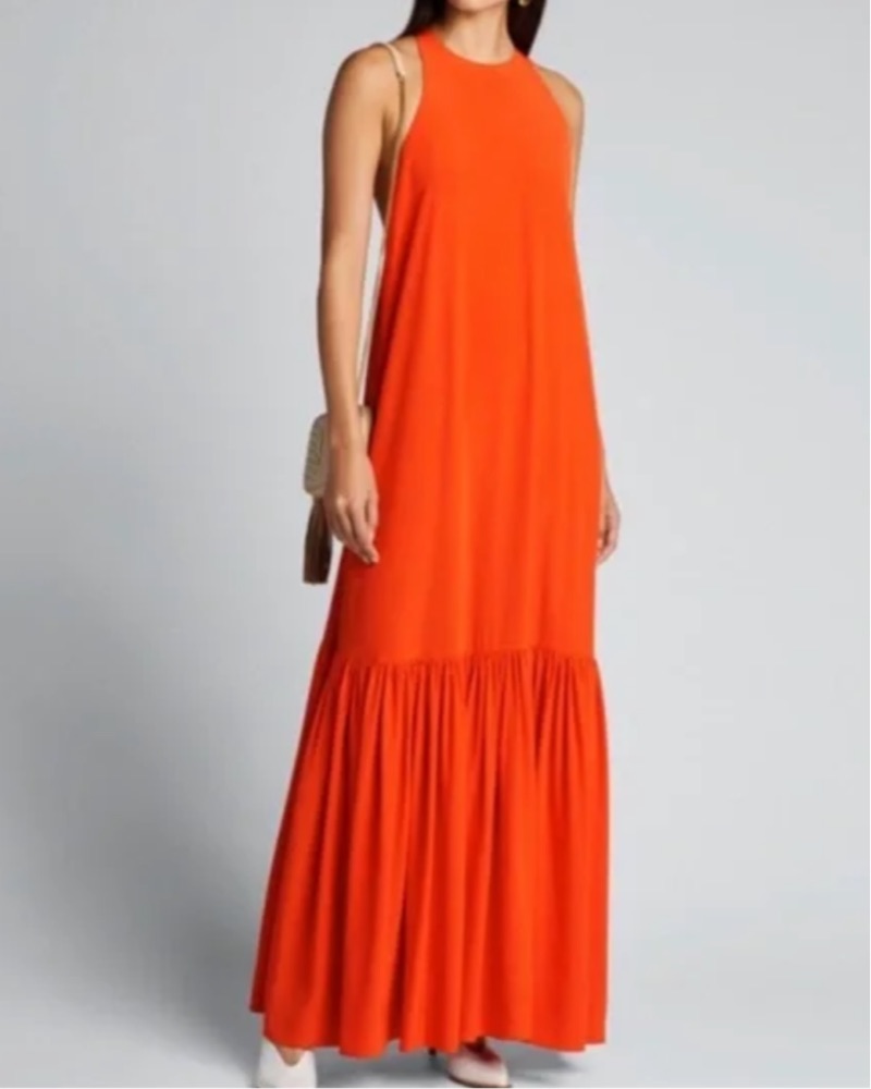 This vibrant, floor-length dress is perfect for a summer wedding or evening event. The intricate floral pattern and playful ruffled hem add a touch of elegance and femininity.
