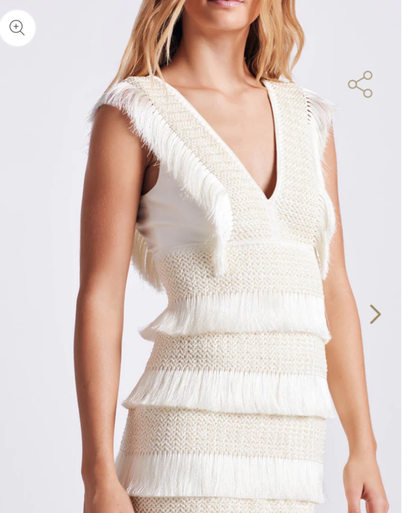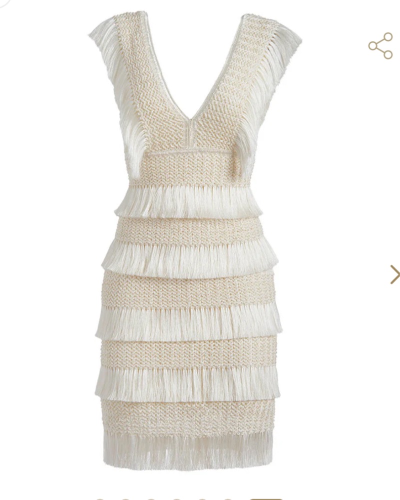 This effortless mini dress is made from stretch Lycra fabric for an easy, comfortable fit. Layers of silky fringe trim with a metallic sheen give movement to the piece. Low v-neckline is compatible with a strapless bra. Concealed back zipper closure. Fully lined. Brand new!