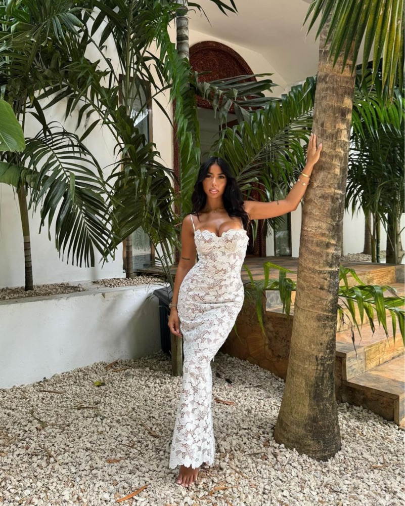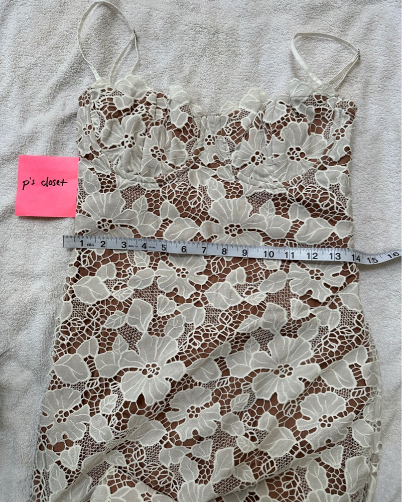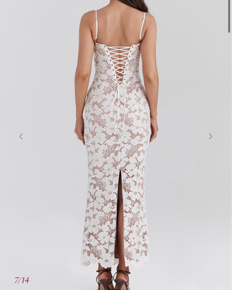 Authentic House of CB Pearl dress. Size Medium regular cup (would say it runs small, I’m usually a size 4-6, 27.5” waist 34D this fit perfectly). White Floral Embroidered Maxi Dress. Fully lined, underwire cups, adjustable lace up back. Length 49”.