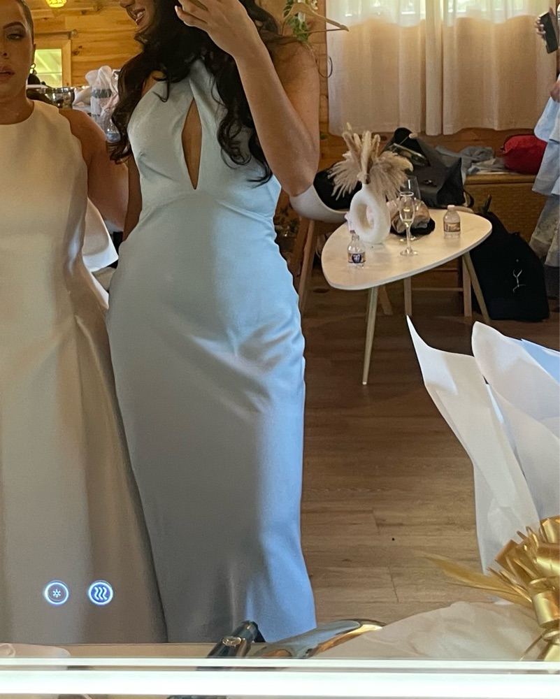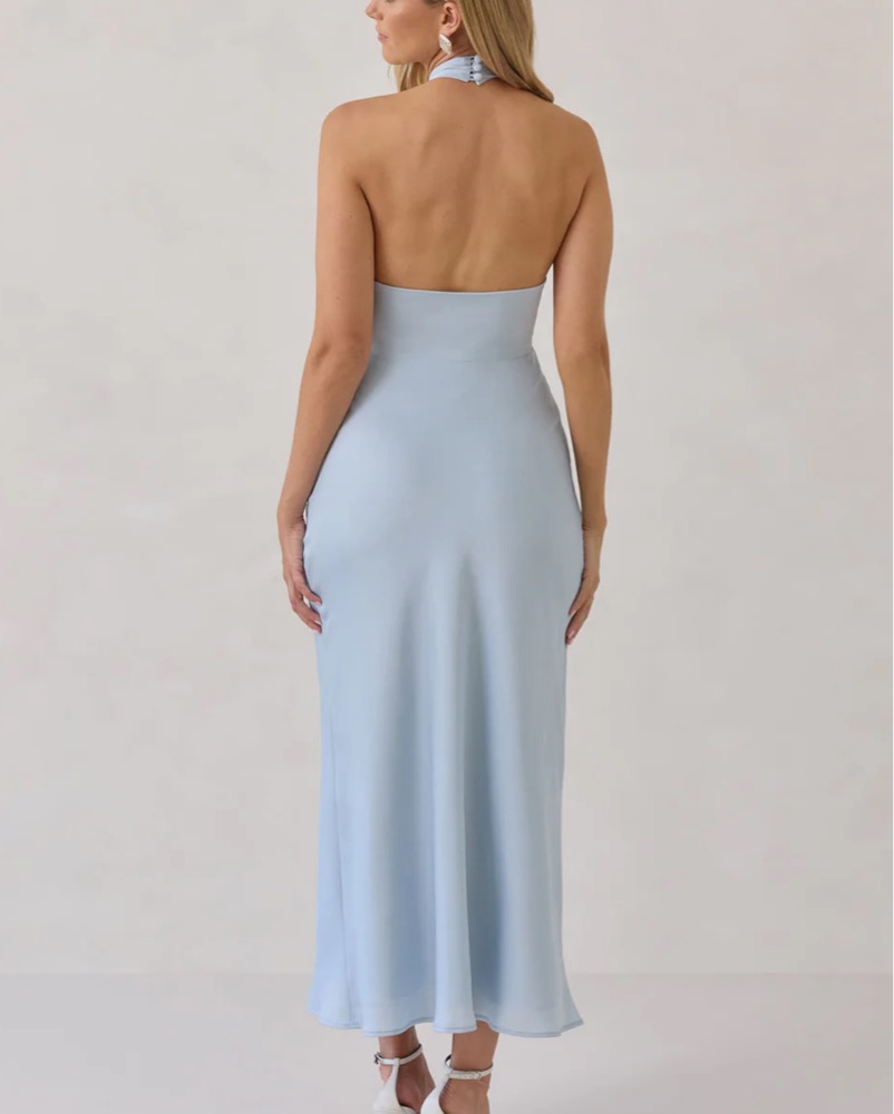 Only worn ONCE Halter neckline with button closure Keyhole detail at front Lined Open back Midi length Bias cut dress with side zipper