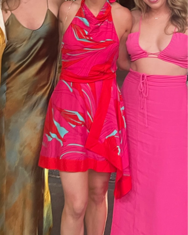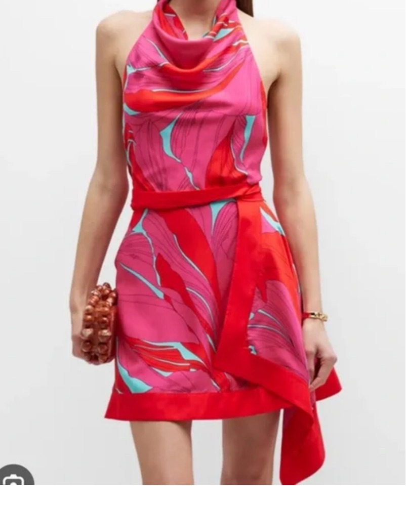 halter dress sifh red, pink and turquoise details. high neck and mostly open back.