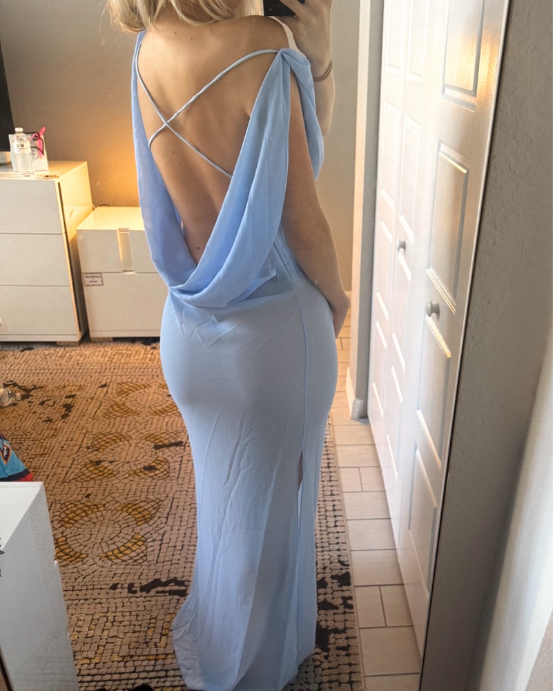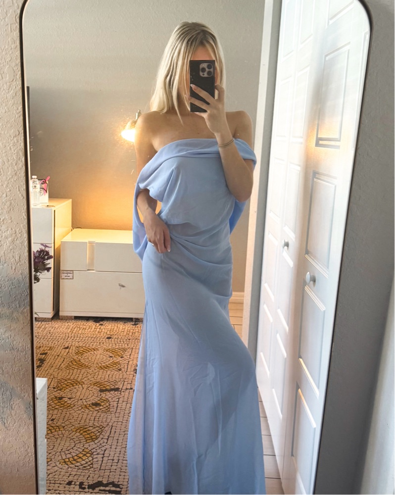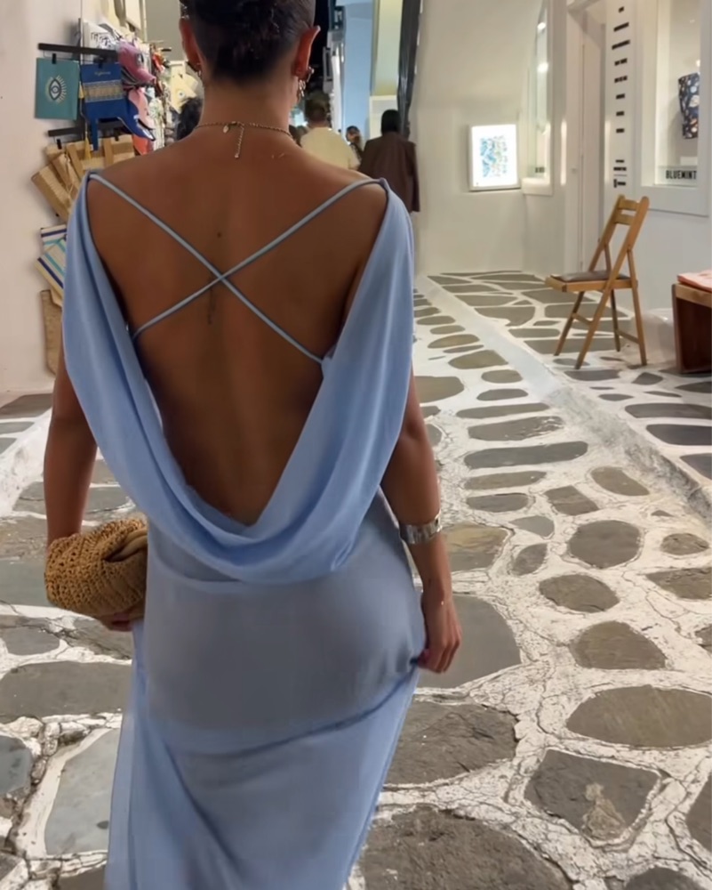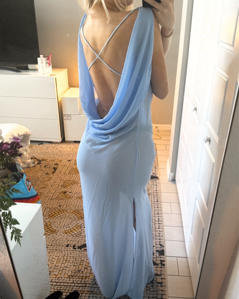 •Bought from a small boutique in Santorini •”One size” fits XS-M Off the shoulder Light blue slip dress backless open back sexy sheer resort wear beach vacation Greece honeymoon girls trip outfit