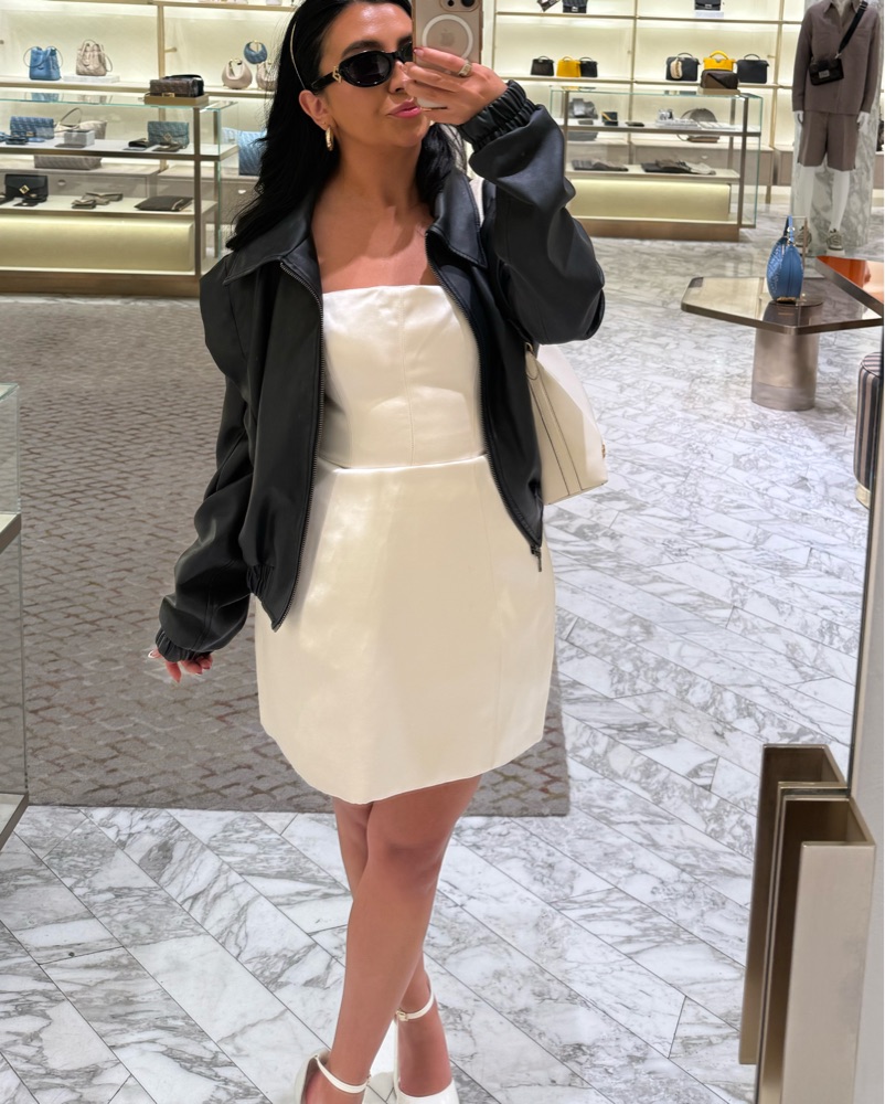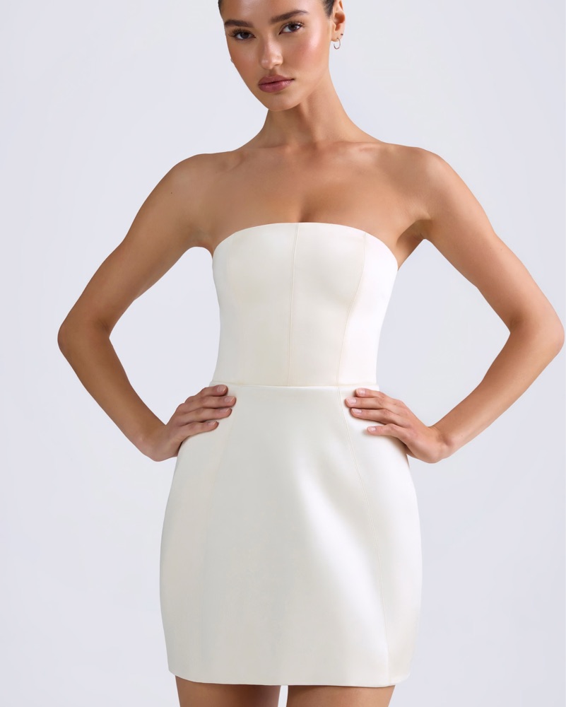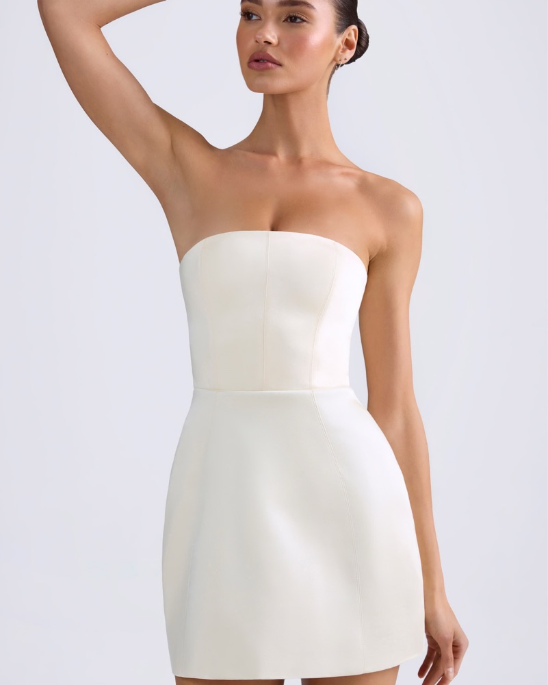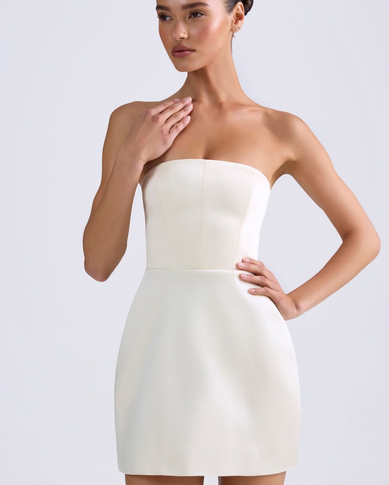 Haisley - Bandeau Structured Tulip Mini Dress in Ivory. Classic minimalism with a structured twist. Modelled on classic styles, the Haisley mini dress is cut from recycled heavyweight satin to a shapely A-line silhouette that sculpts the waist and flares out at the hips. Loop