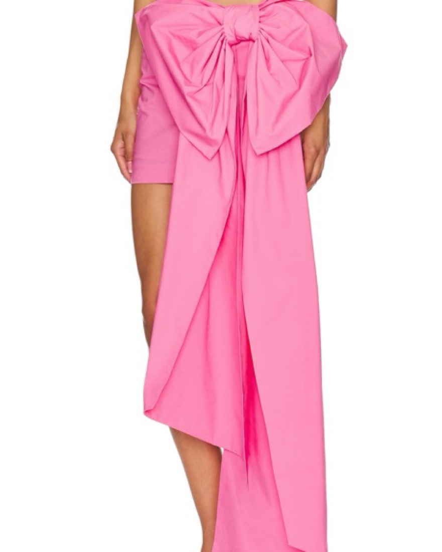 This eye-catching fuchsia two-piece set is perfect for a night out on the town. The twist-front crop top and high-slit skirt create a bold, sultry look that is sure to turn heads. Bow shortened a bit from revolve worn once
