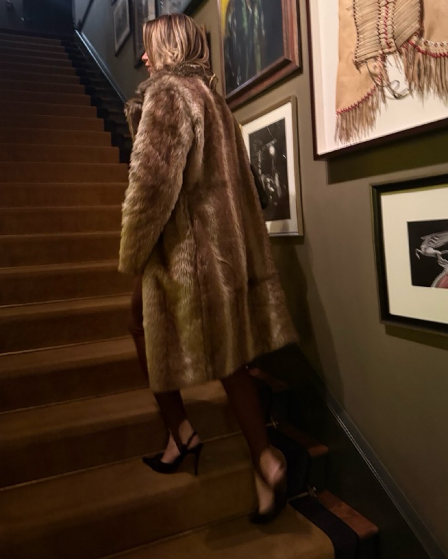 Long brown fur trench coat. Perfect for apres ski and winter trips!