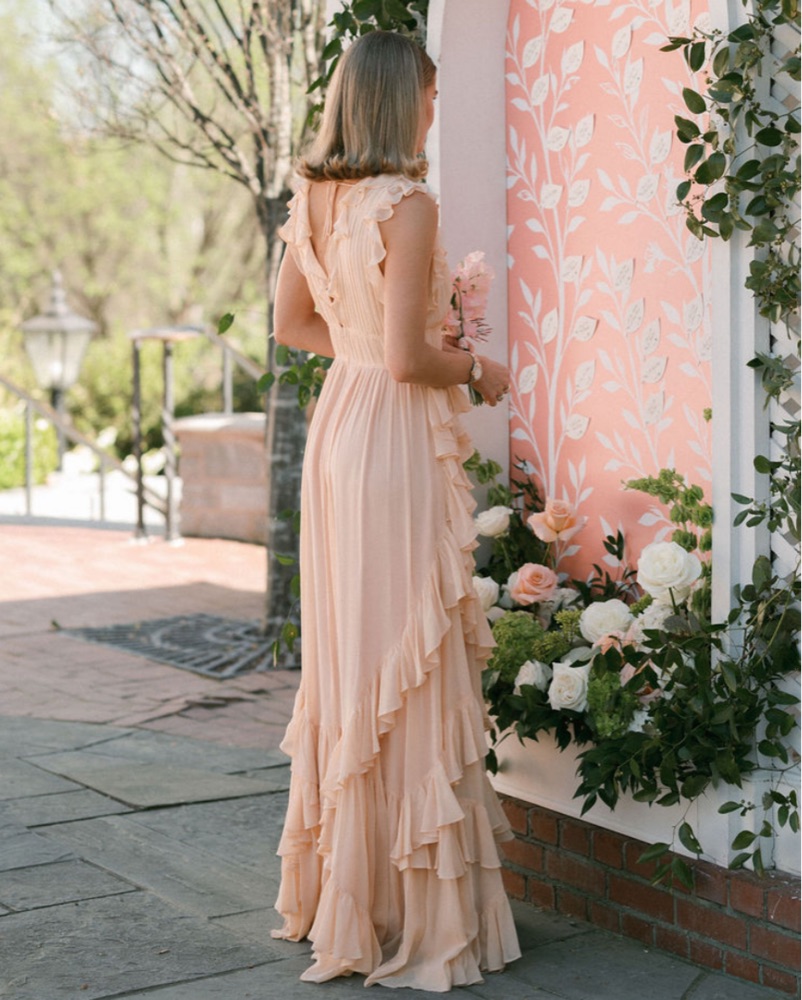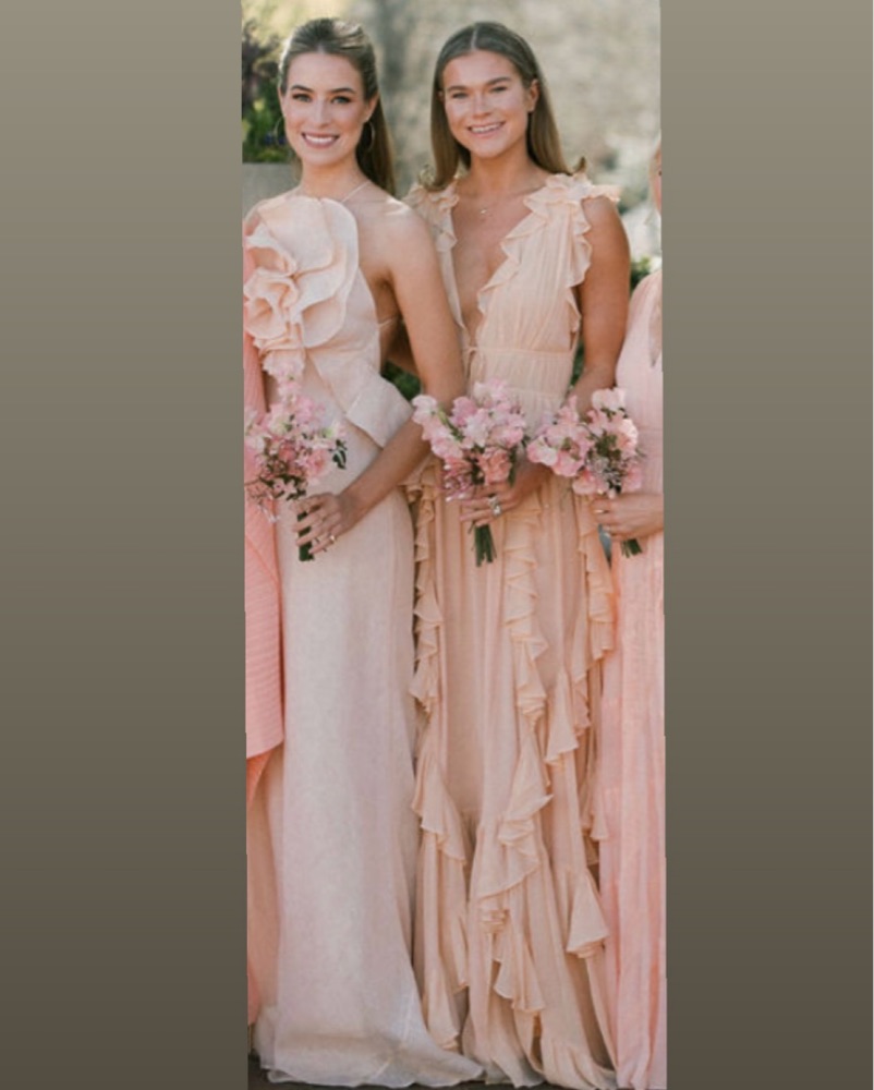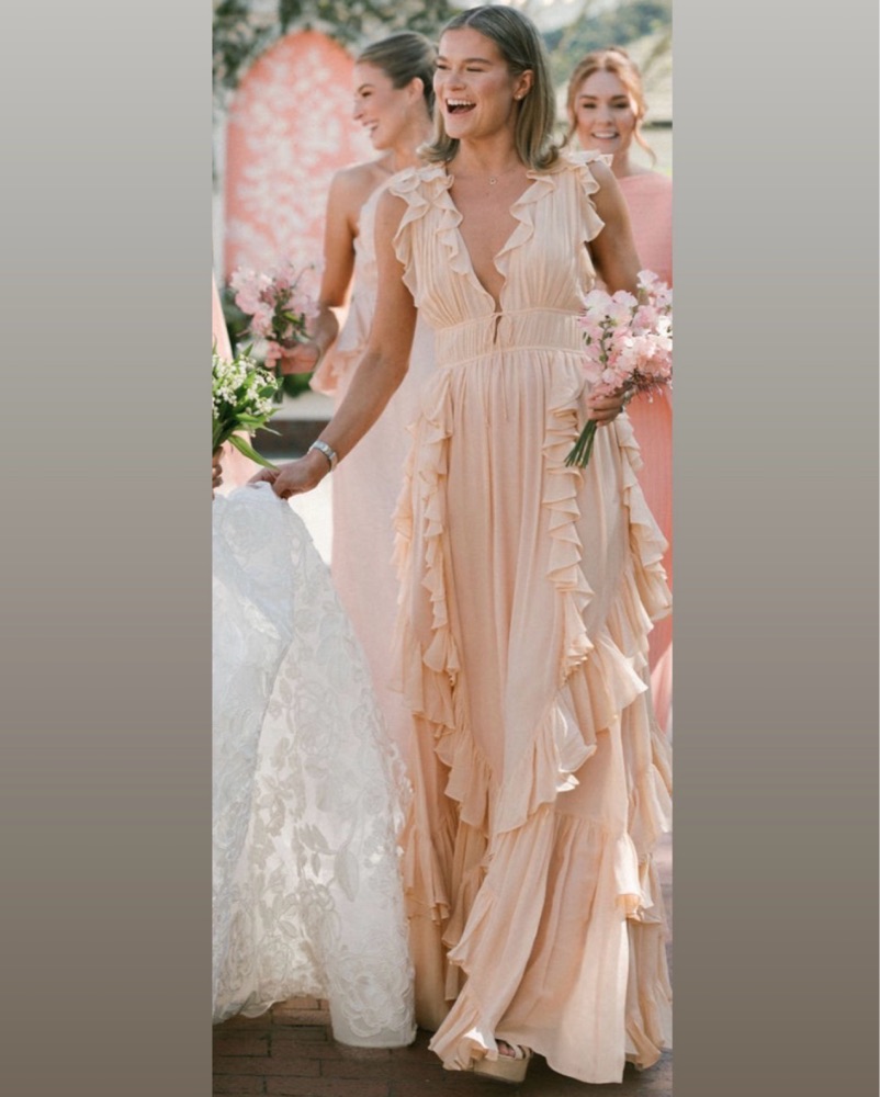 Peach ruffle gown - perfect wedding guest / bridesmaid dress. It’s lightweight but has the most beautiful movement for dancing!!! I’m 5’7 for reference