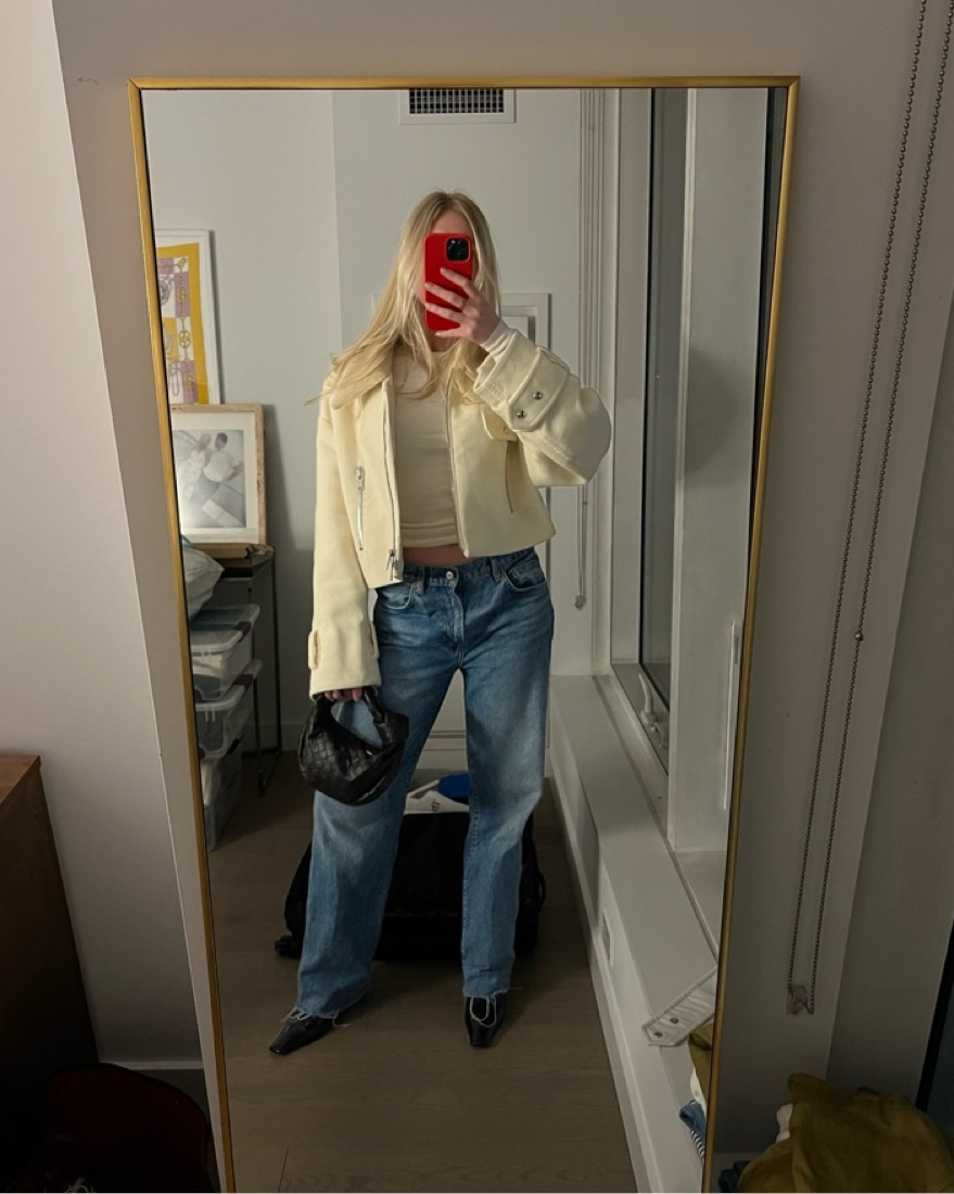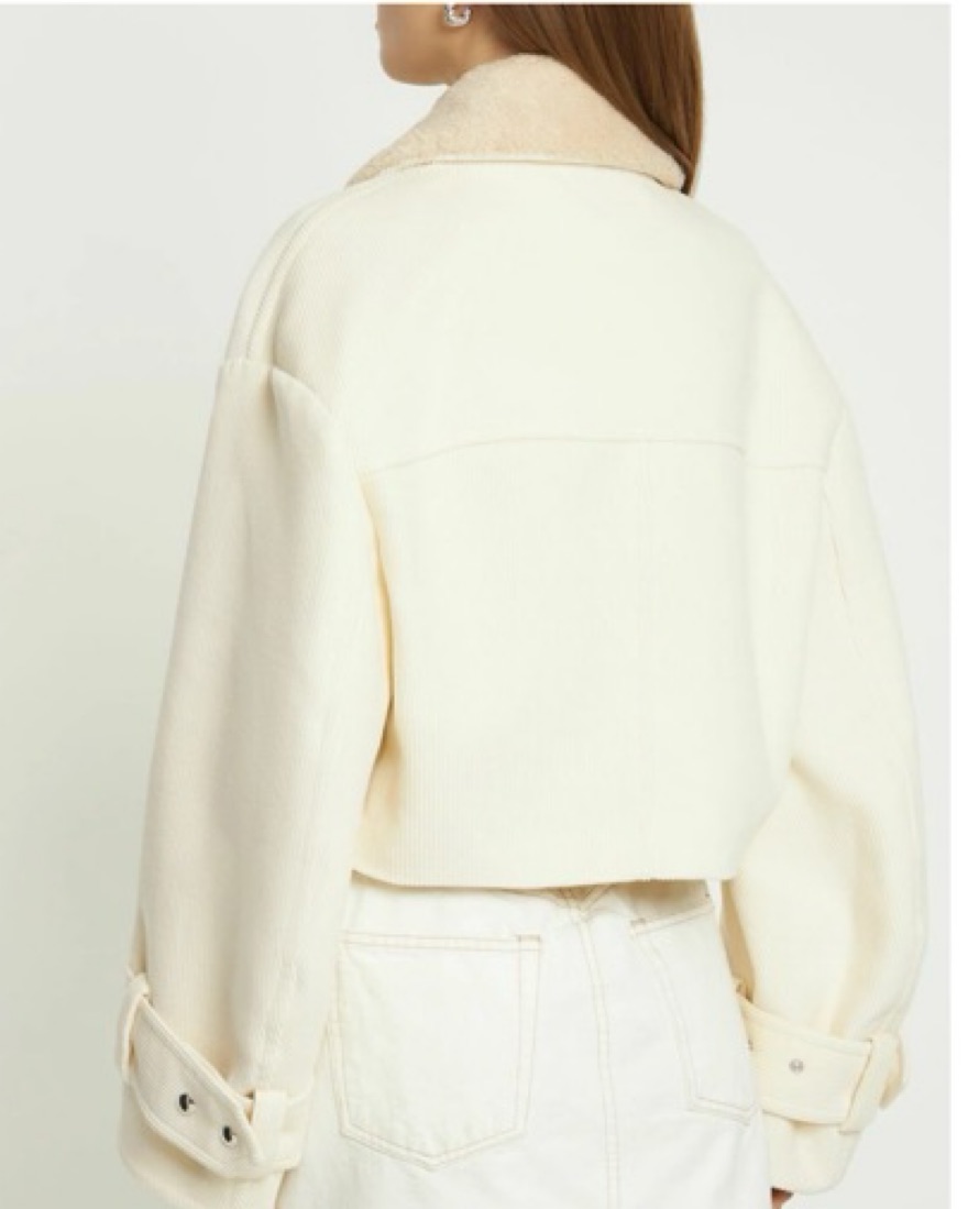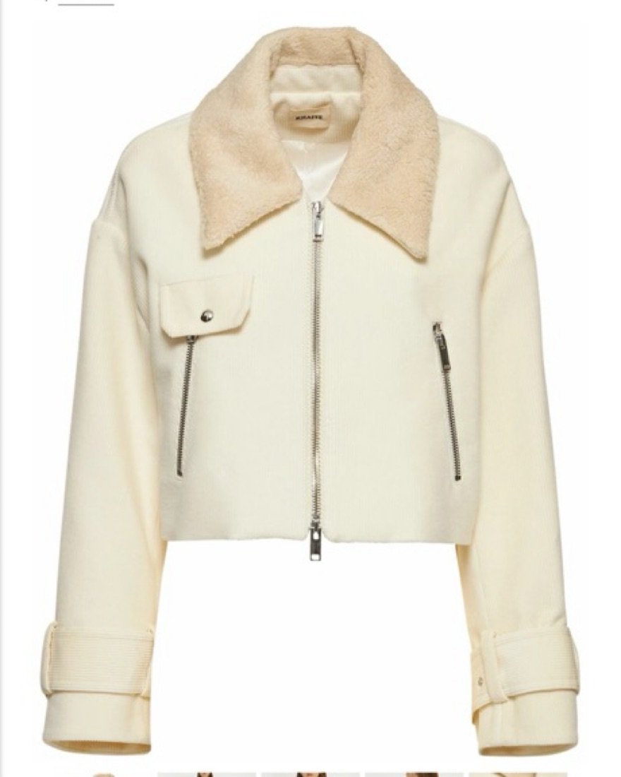 Off white corduroy and shearling moto jacket. Size large for an oversized cool look! I’m 5’7 and this is a bit wide and baggy on me! Delicate renters only. If this is returned with stains you will be liable for additional cleaning fees! No self tanner.