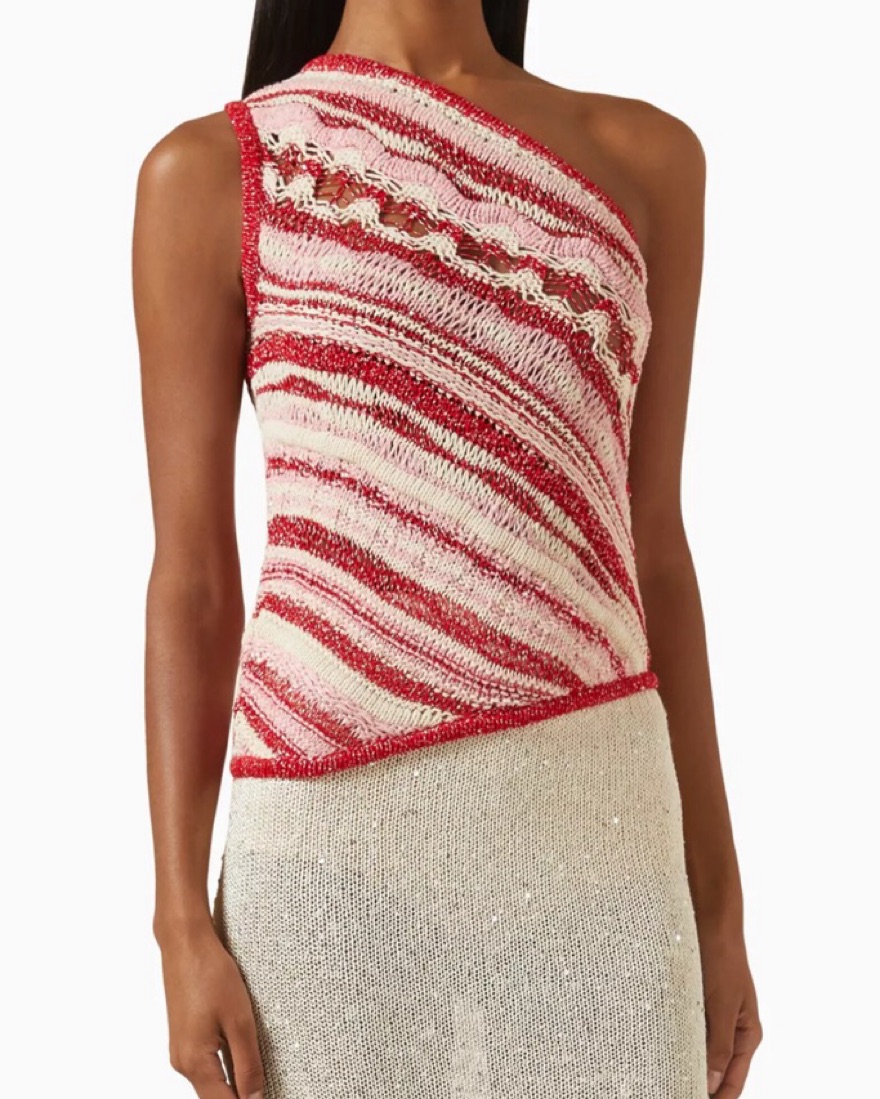 Asta Resort Eden Top - Rosetta Sequin in Red. - size M but fits like a S - Rosetta Sequin in Red. 63% cotton 30% polyester 6% viscose 1%. Made in Portugal. Hand wash. Pull-on styling. Tricot fabric with sequin embellishment and asymmetric hem. AORR-WS13. SS24ETR
