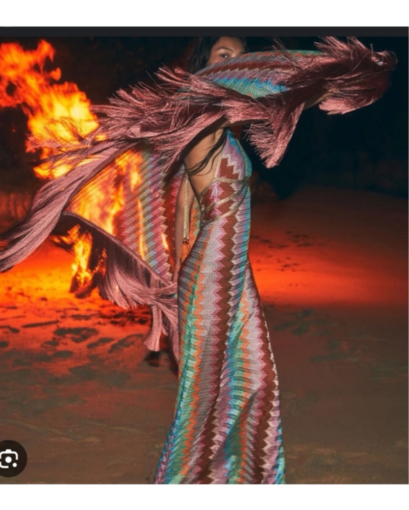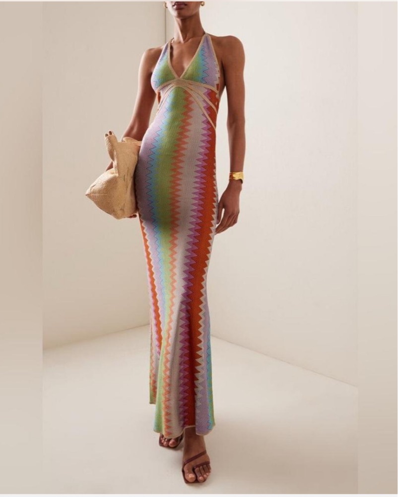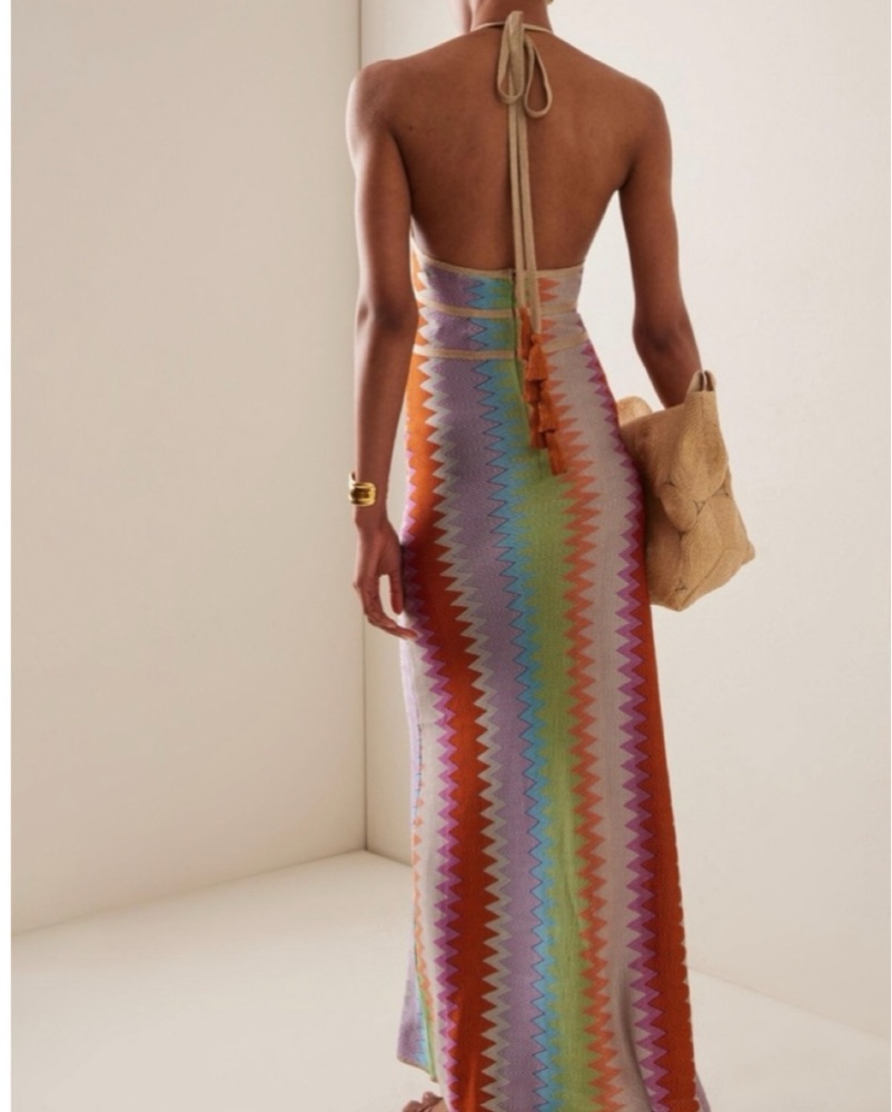 The 'Enna' maxi halter dress has a chevron-knit construction woven in colorful tones. Perfect for a euro vacation or beach soirée. Best for a 4/6 (small/medium)
