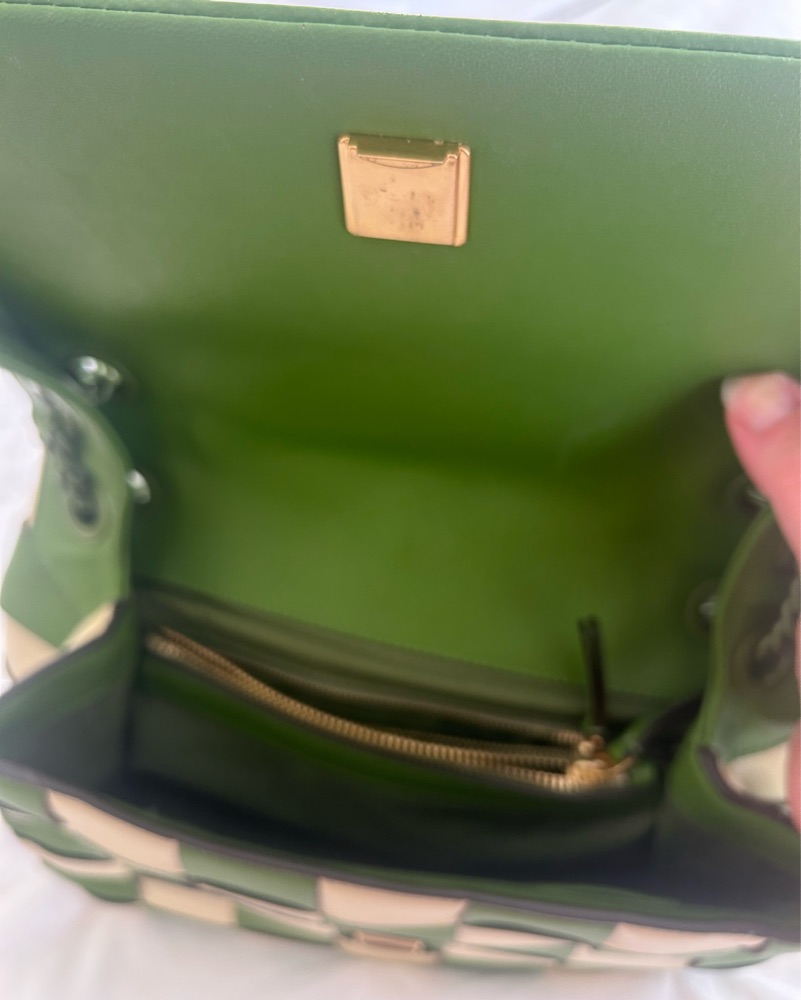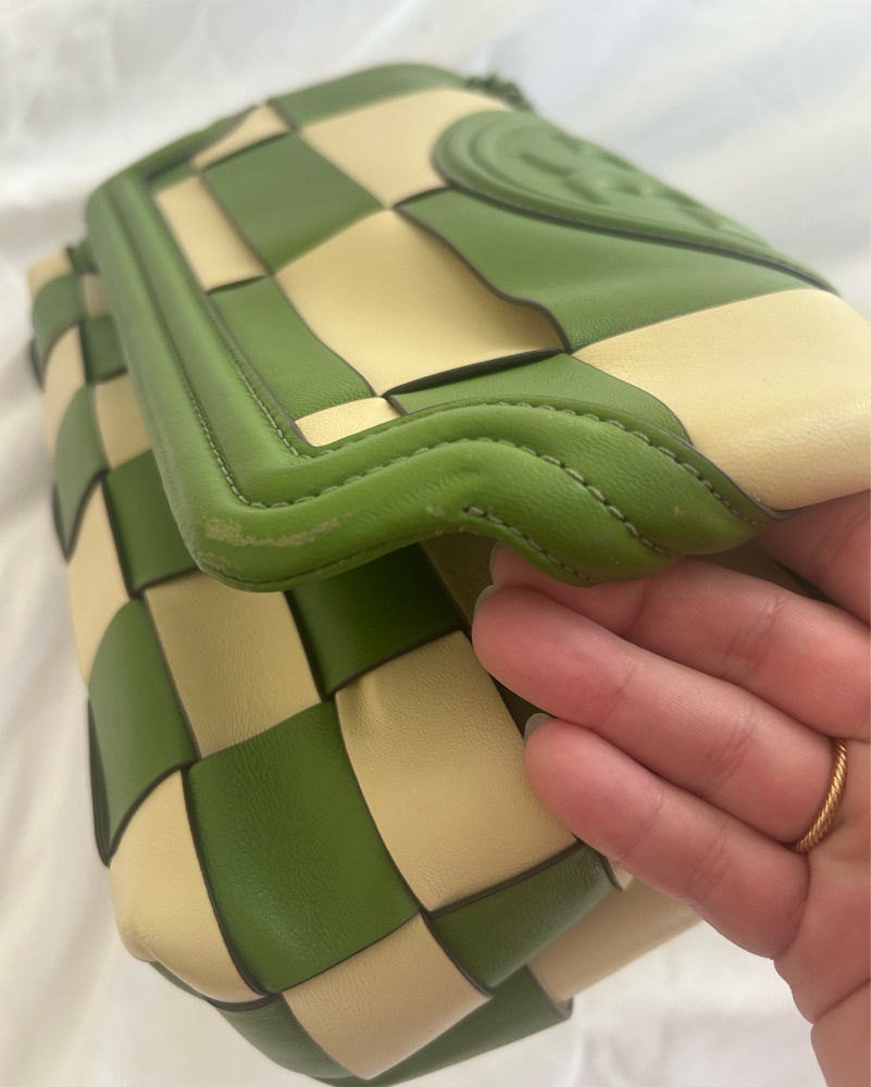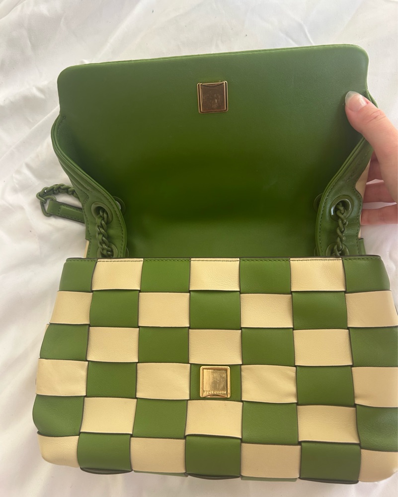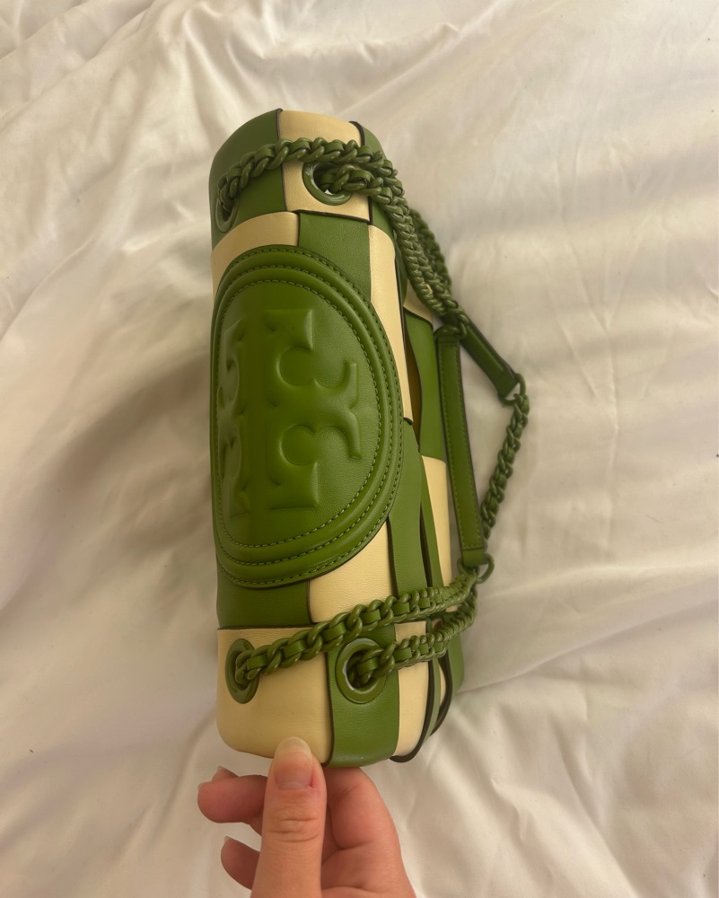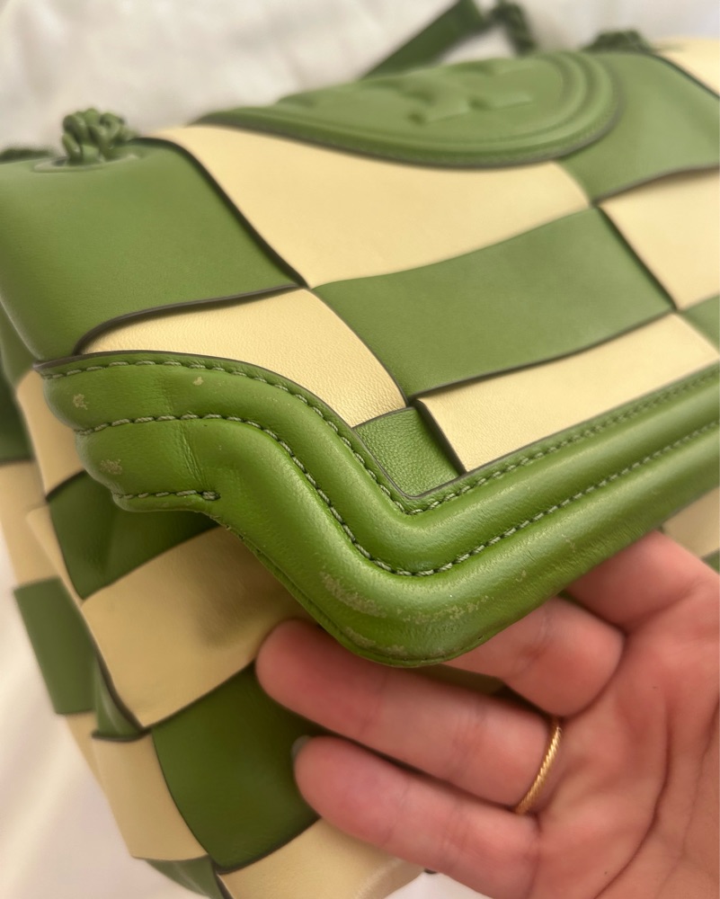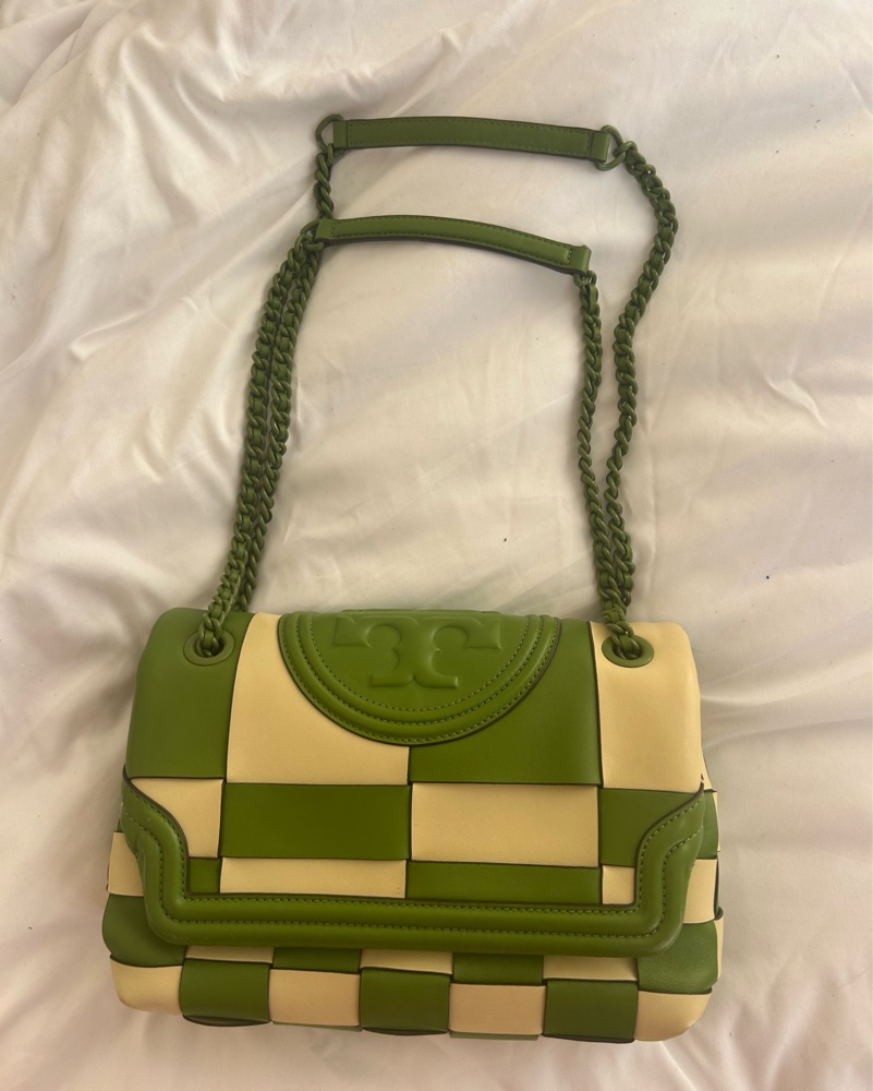 Green and cream woven leather bag from Tory Burch. Fits a lot - can fit some books. Little bit of wear on the straps and front - hardly noticeable on.