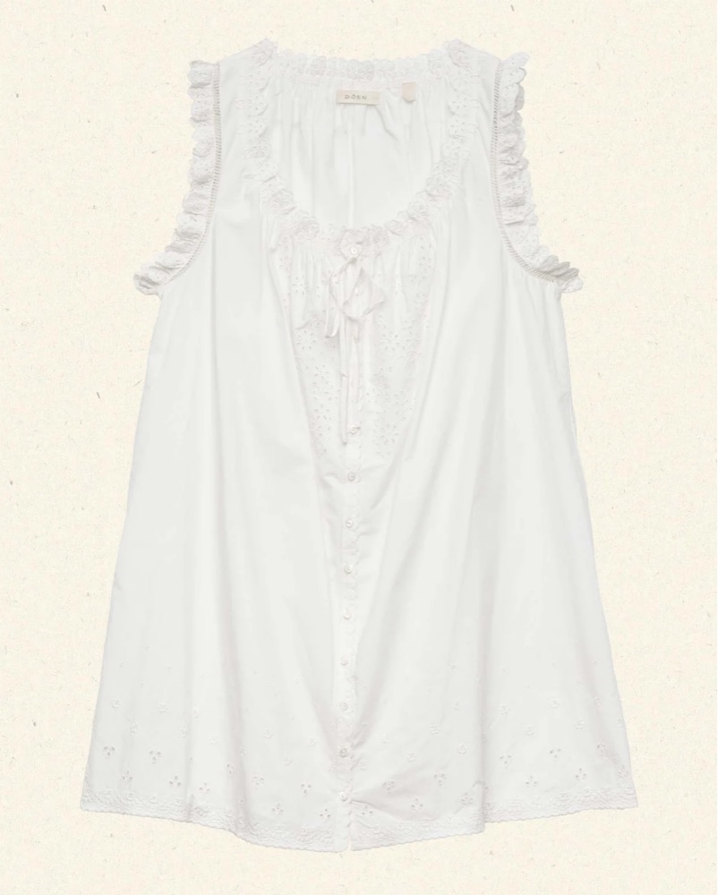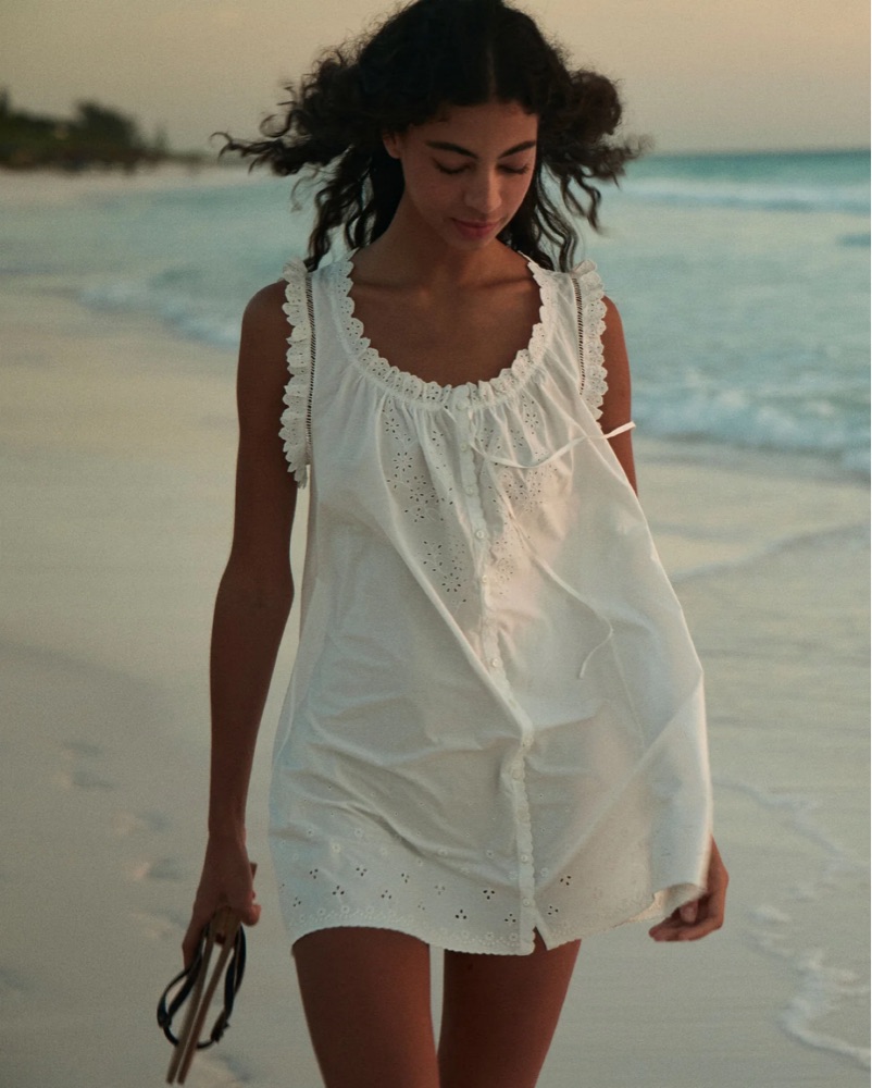 Sold out in stores and online! The summer dress of the season —features a breezy silhouette with a scoop neckline, mother-of-pearl buttons, and a grosgrain ribbon tie. Scallop eyelet embroidery and ladder trim accent the neckline and sleeve openings, while a floral eyelet design accents the yoke and