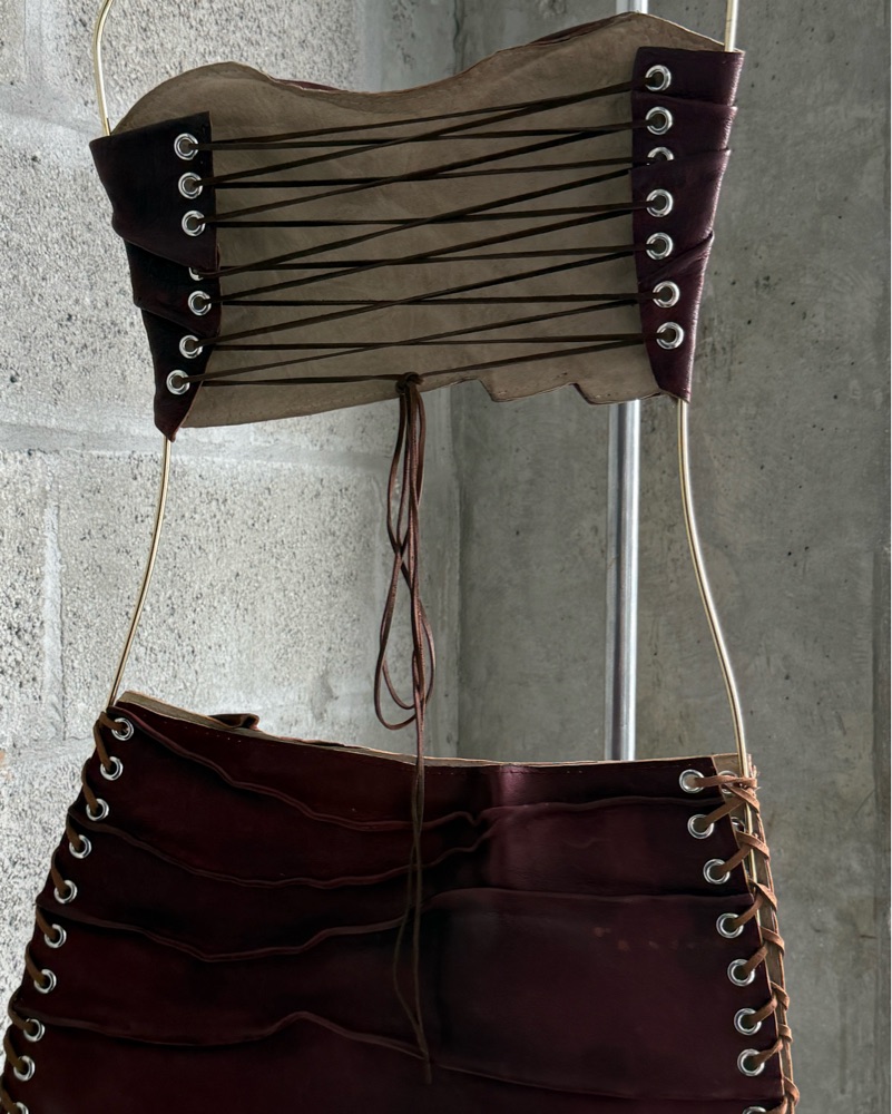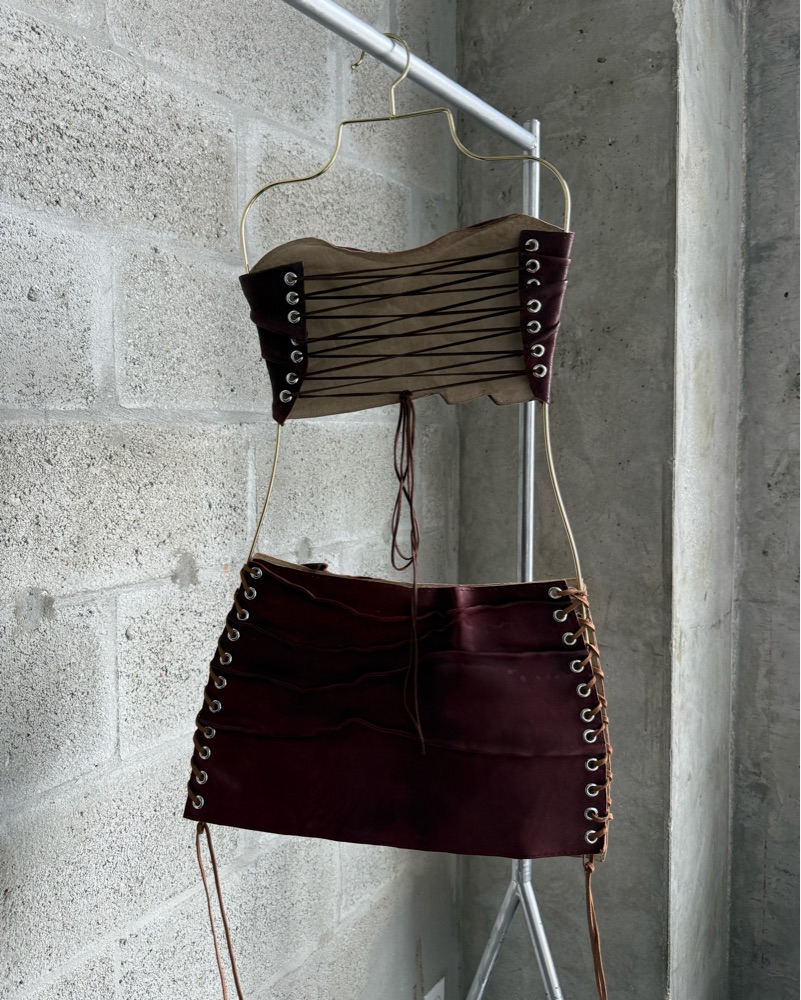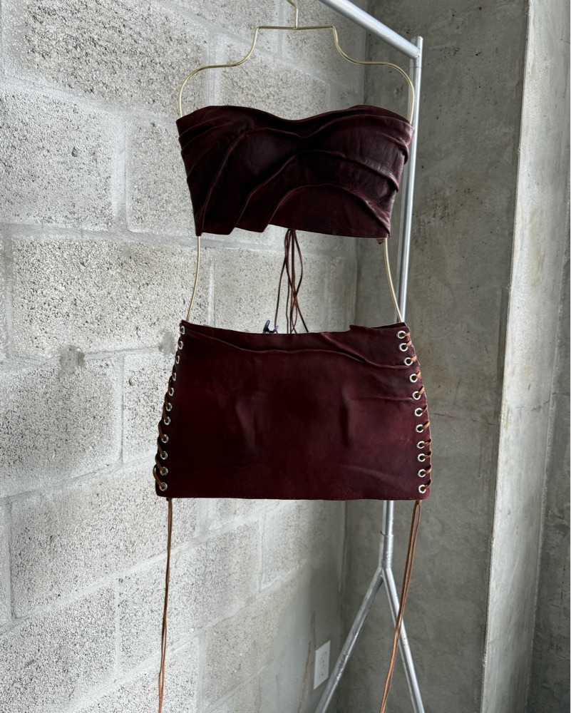 Elevate your style with this striking burgundy leather set. Ideal for a night out or special event, this ensemble exudes confidence and edge. Can fit small-large.