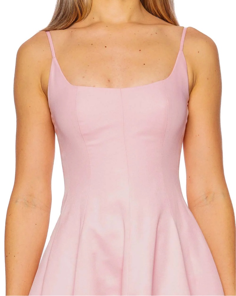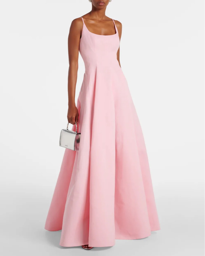 This pink maxi dress features a formfitting bodice with a square neckline sweeping into a full a-line skirt.