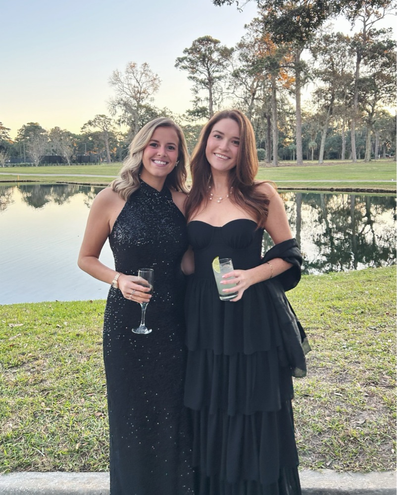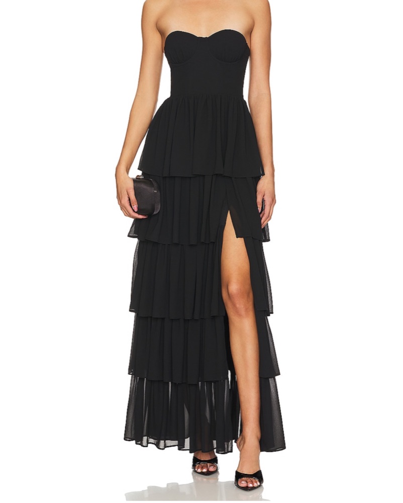 A stunning black maxi dress with a sweetheart neckline and cascading ruffle tiers. Perfect for a formal event or elegant night out.