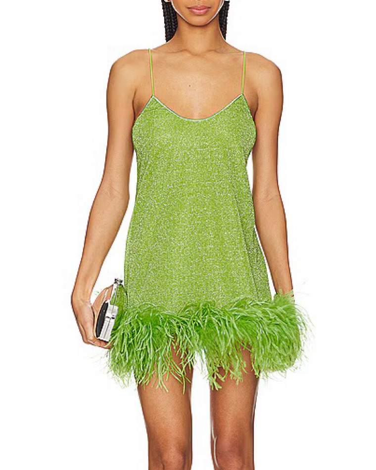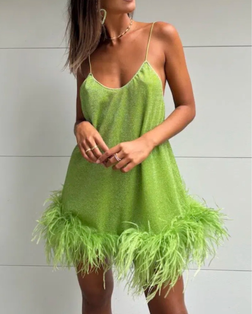 This dazzling green dress with feathered trim is perfect for a night out on the town or a special event. The figure-flattering silhouette and eye-catching color make it a statement piece. Fits like a small / medium