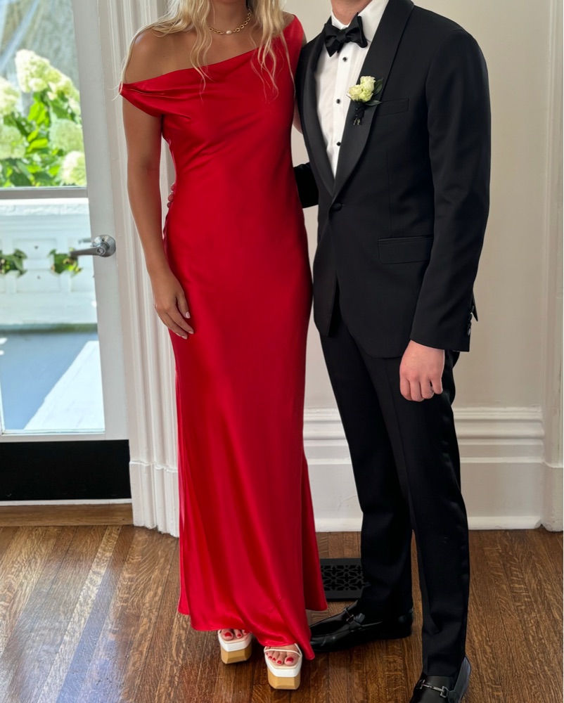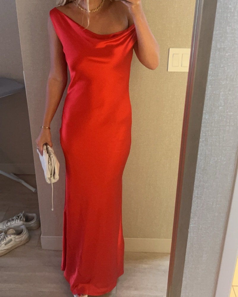 Beautiful off the shoulder red silk dress. Drapes beautifully and never been altered.