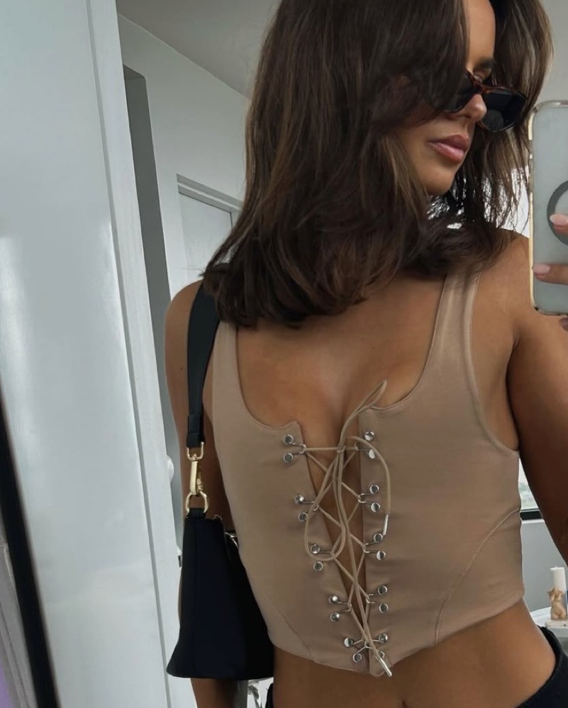 The most stylish tan lace up skirt and top set. Perfect for a night out!