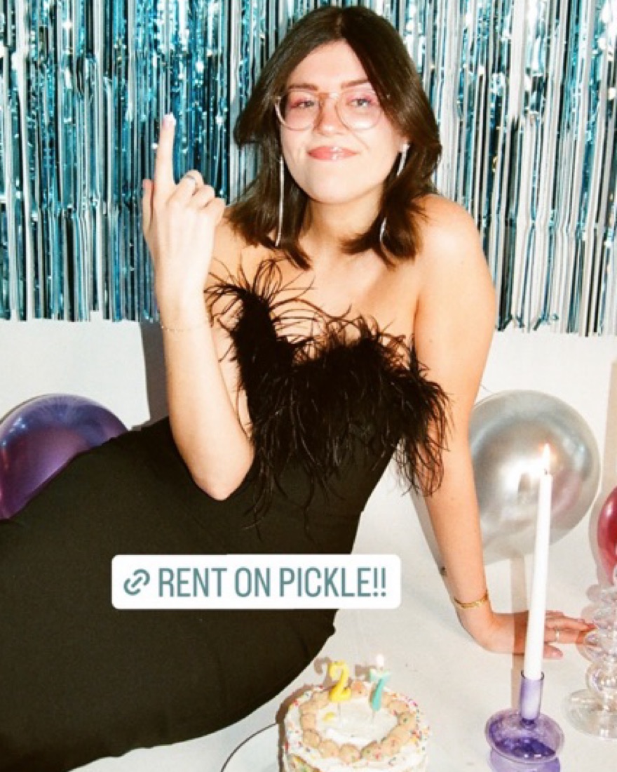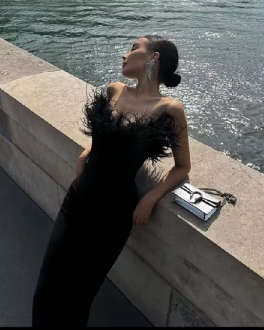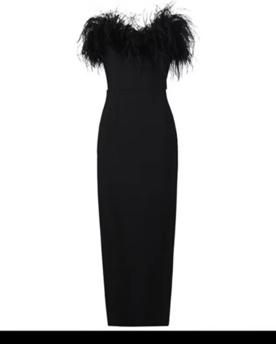 Size m stretchy flattering thick fabric strapless gown with black feather detail at top. Would say fits a size 4 best. Keywords: wedding guest dress, black tie, feather dress, masquerade
