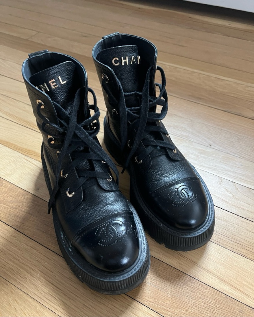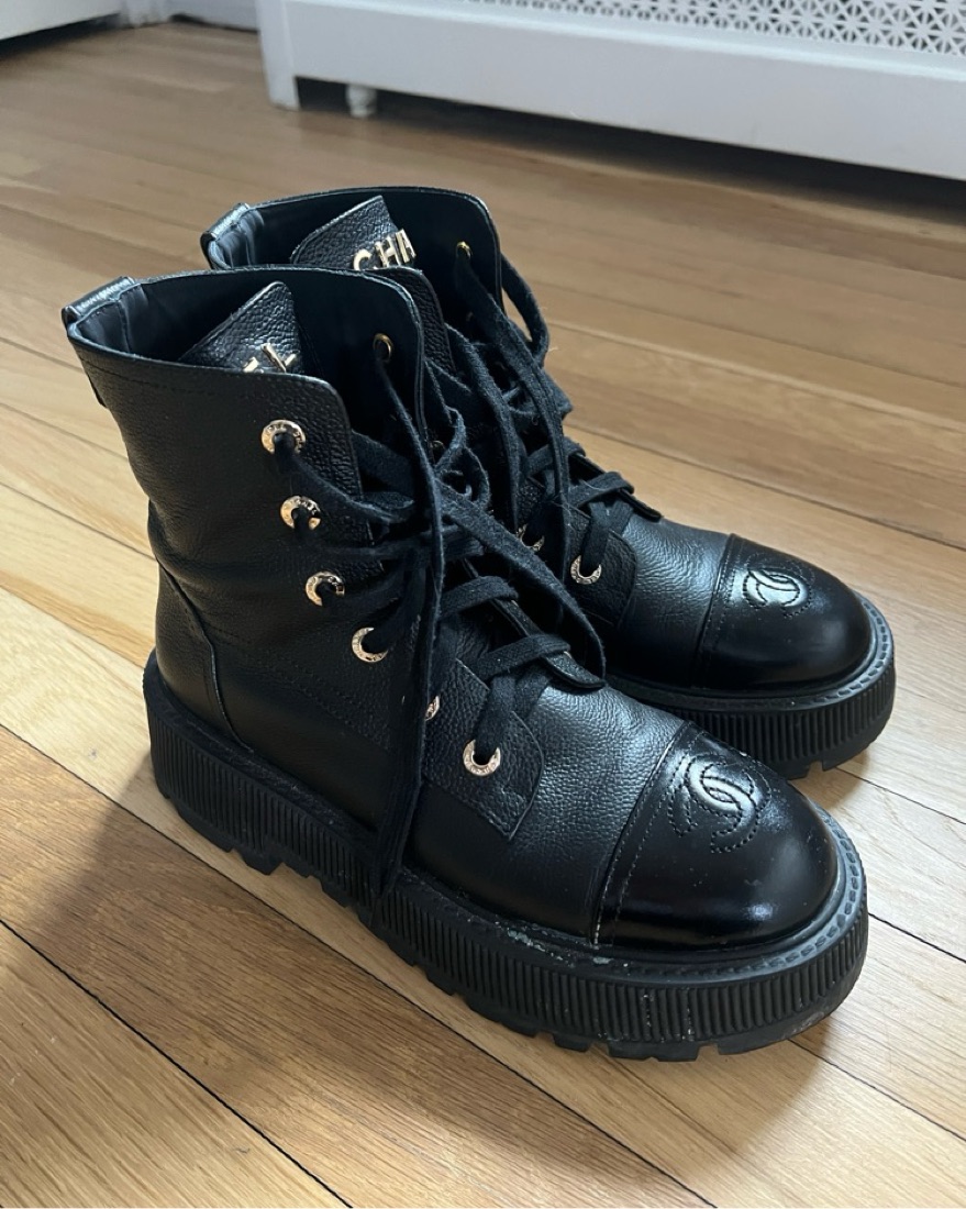 These Chanel platform boots bring an edgy, fashion-forward look to any outfit. Versatile enough for a night out or a casual daytime look.