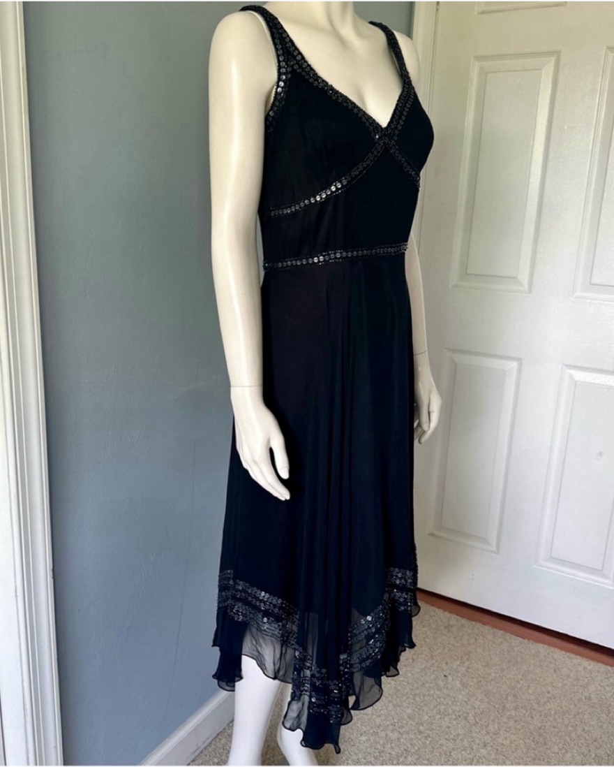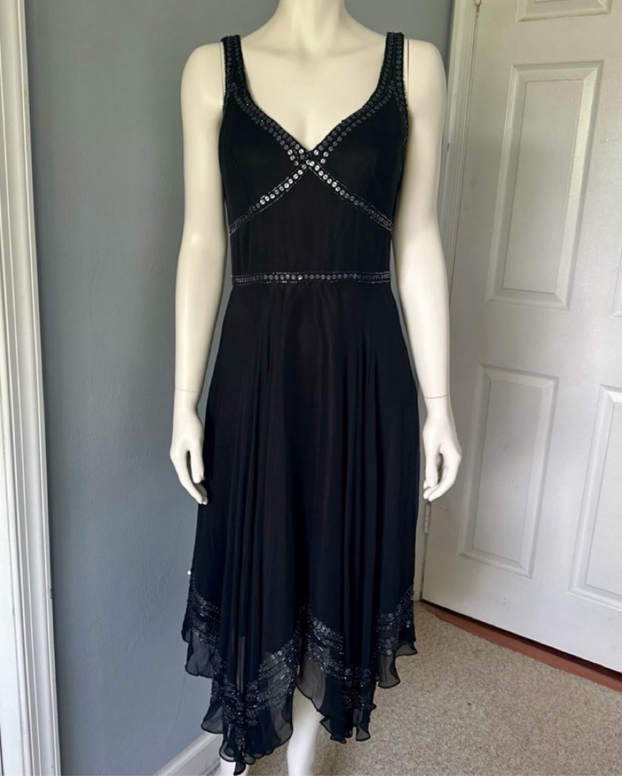 Prepare to look stunning in this Gorgeous Y2K style dress by adrianna papell. Can be dressed up with some sequin heels and a sparkly clutch, or dressed down with some cute slingbacks and a shoulder bag. The skirt is beautiful and flowy.
