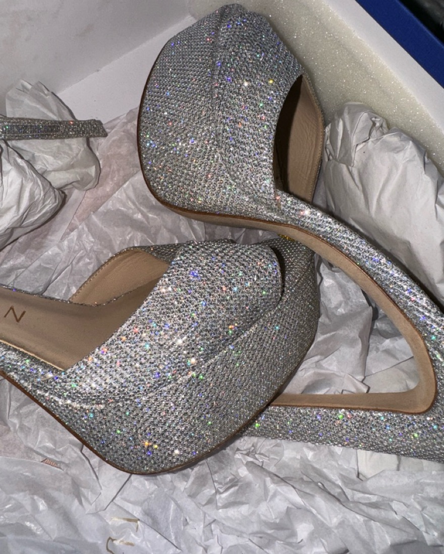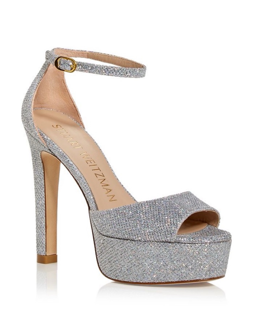 The Stuart Weitzman Disco Platform Sandal in Crystal silver rhinestones sequins. Buckled ankle strap.