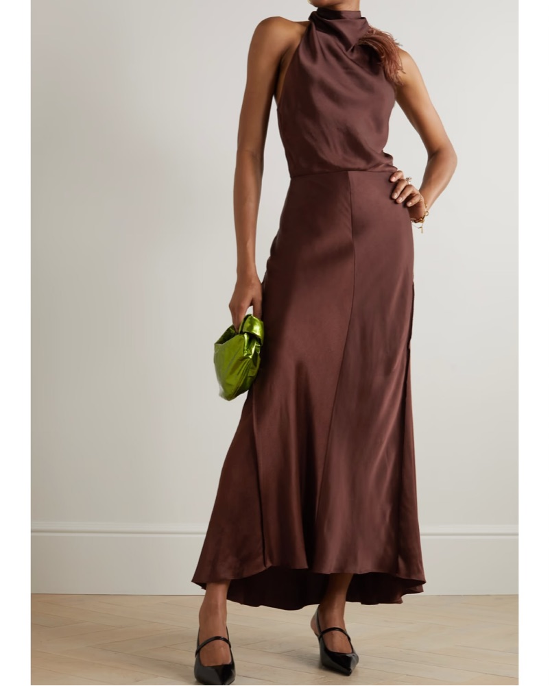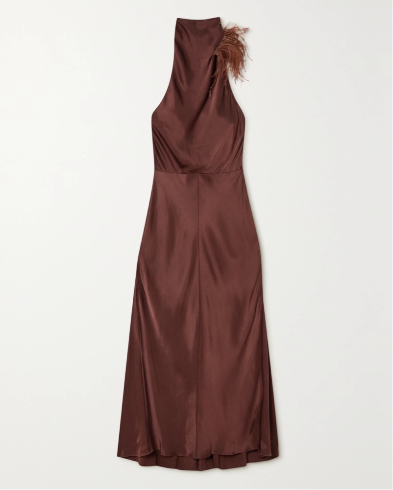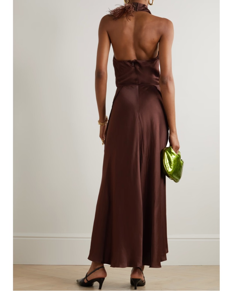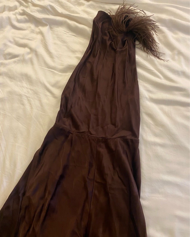 Vince feather draped-neck open-back maxi dress in brown. Ostrich feathers at neck with low open back. Size 2 but would say it works for a 4 or S.