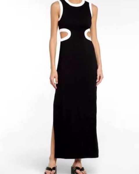 Black maxi dress with white trim and side cutouts. Thick, stretchy fabric that’s flattering and comfortable. Great condition.