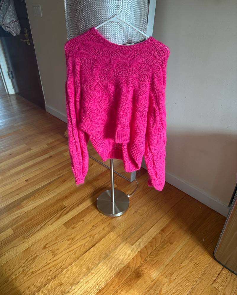 This cozy fuchsia sweater is perfect for dressing up or down. The intricate cable knit pattern adds visual interest and texture.