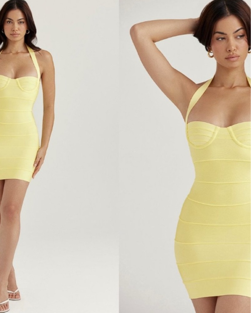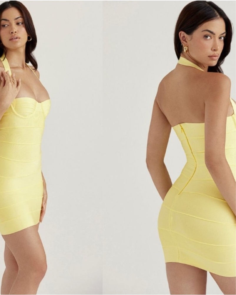 House Of CB Maliha Buttercup Bandage Halter Mini Dress Yellow Sculpting