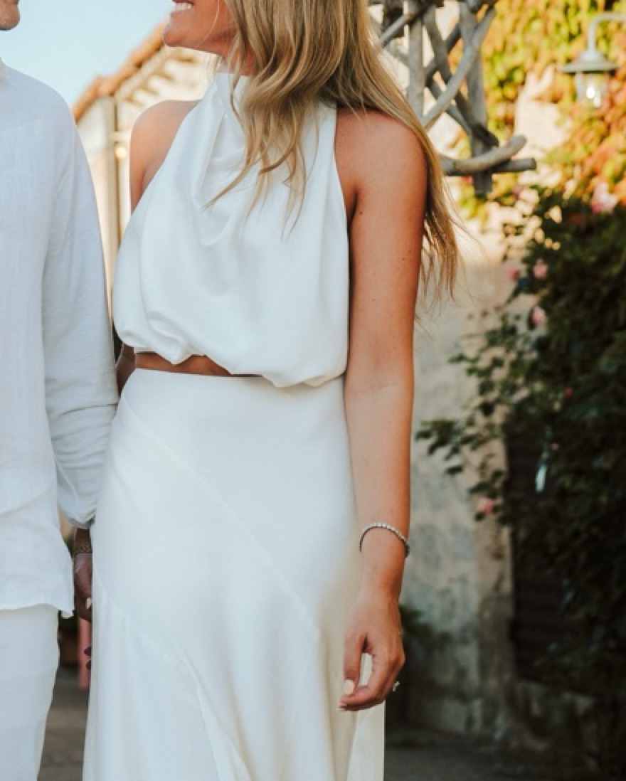 off-white crepe texture high waist A-line concealed side zip fastening long length & off white high neck top with open back