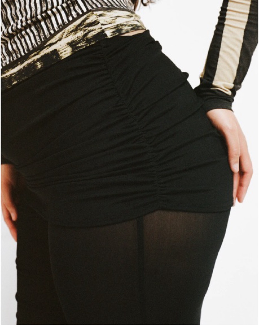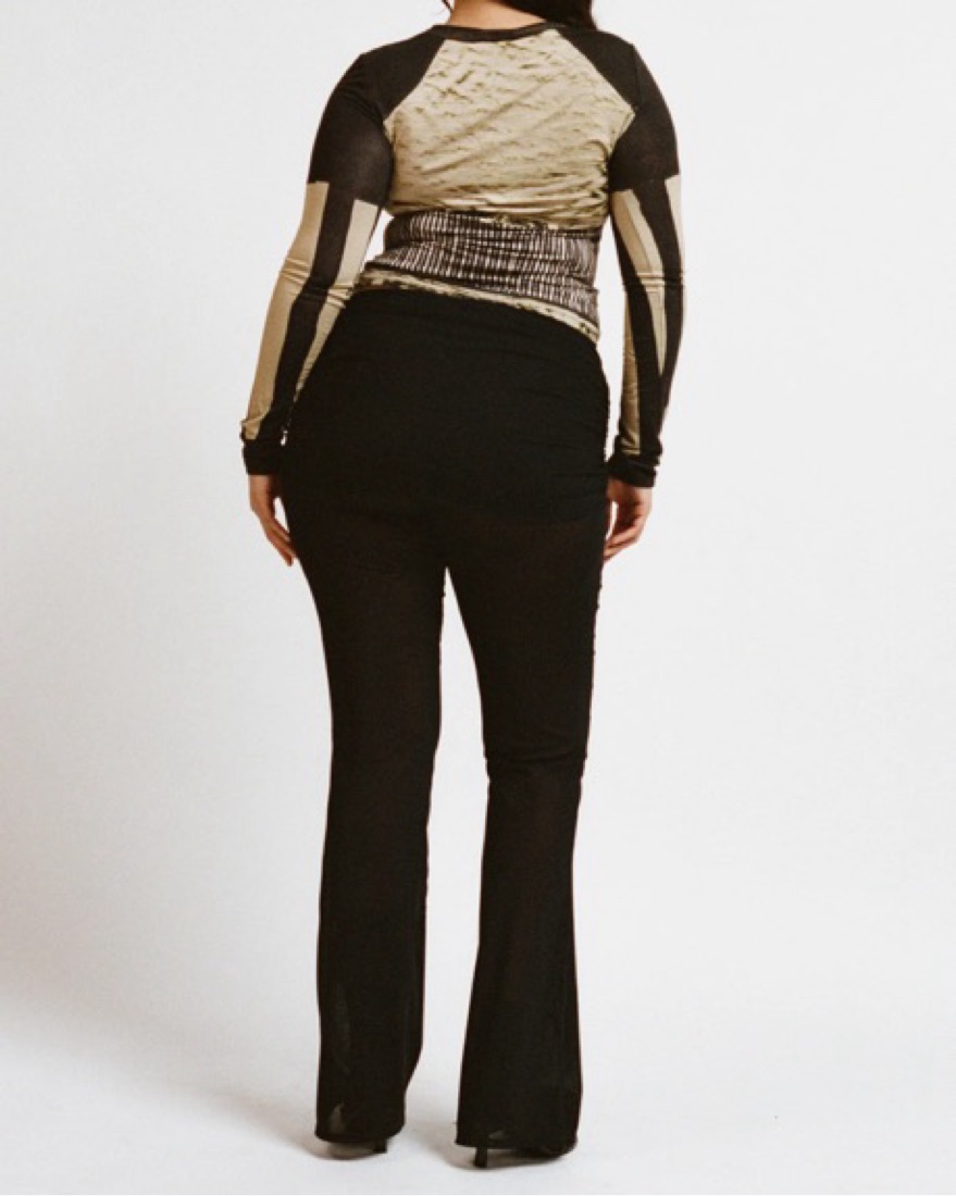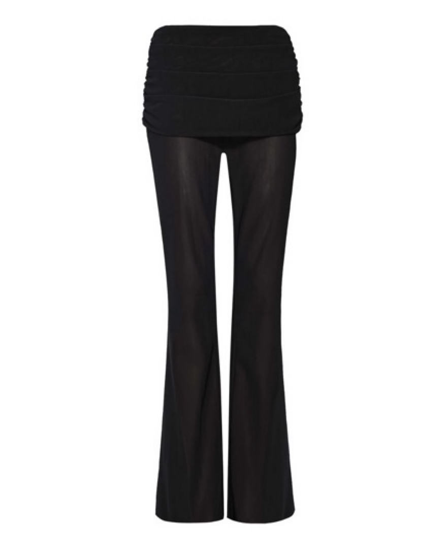 This mid-rise sheer pant flares slightly at the bottom and can be folded over along the waist as a styling detail. The perfect everyday pant.