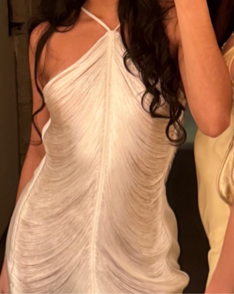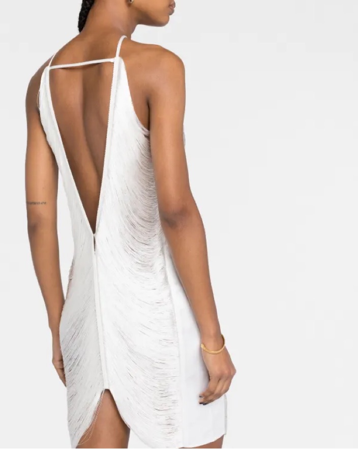 Cult Gaia’s Mara minidress is just as artful as the label’s sculptural bags. It’s threaded from metallic-silver fringes that drape down from a sleek halterneck. The notched hem mirrors the deep V-back.