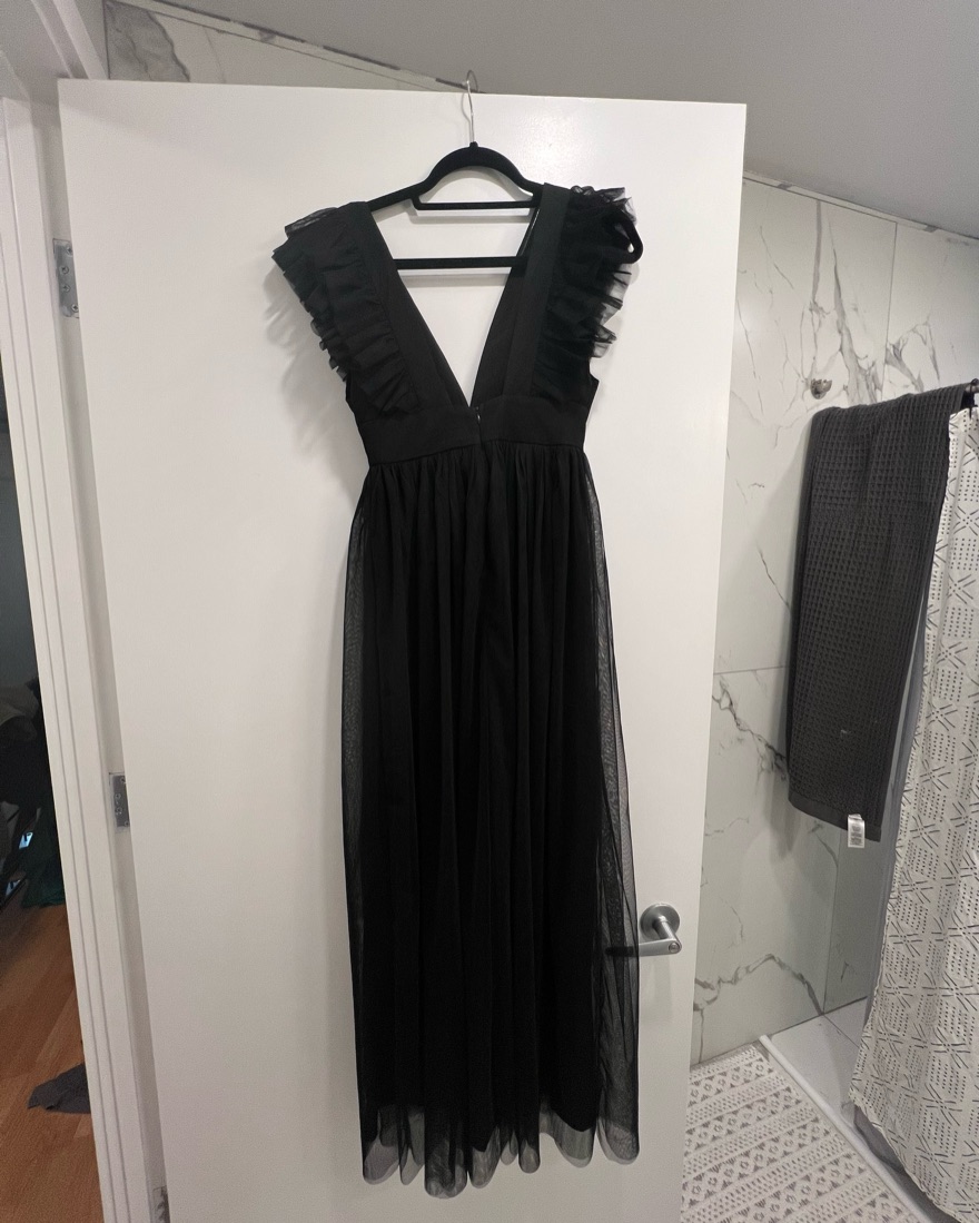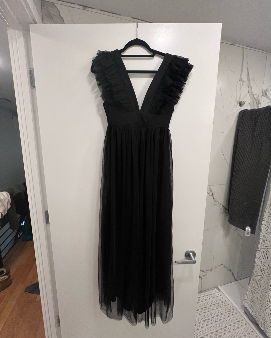 Worn once for black tie optional wedding, has been altered to fit 5’2” (with 3 inch block heels) and 110 lbs