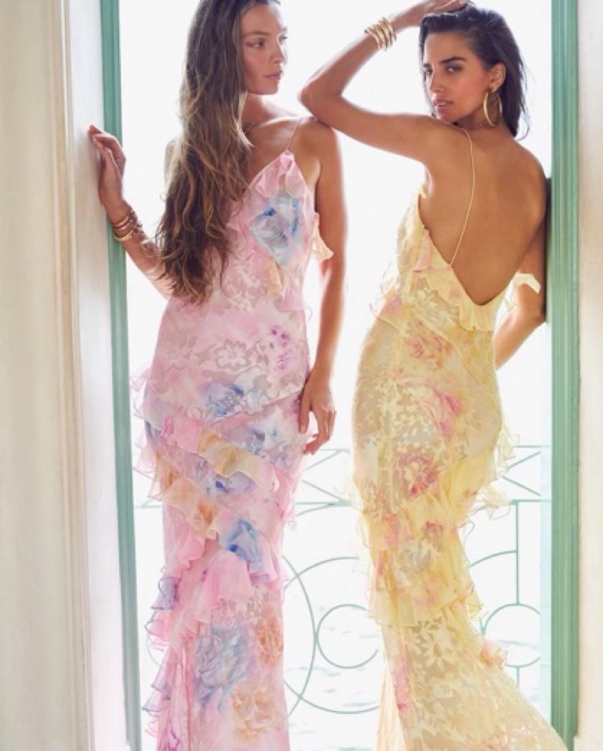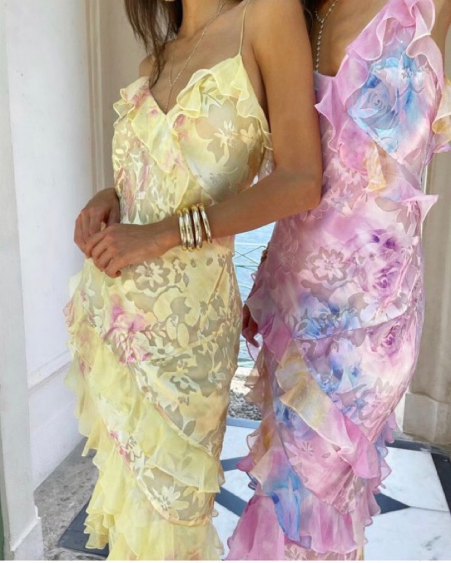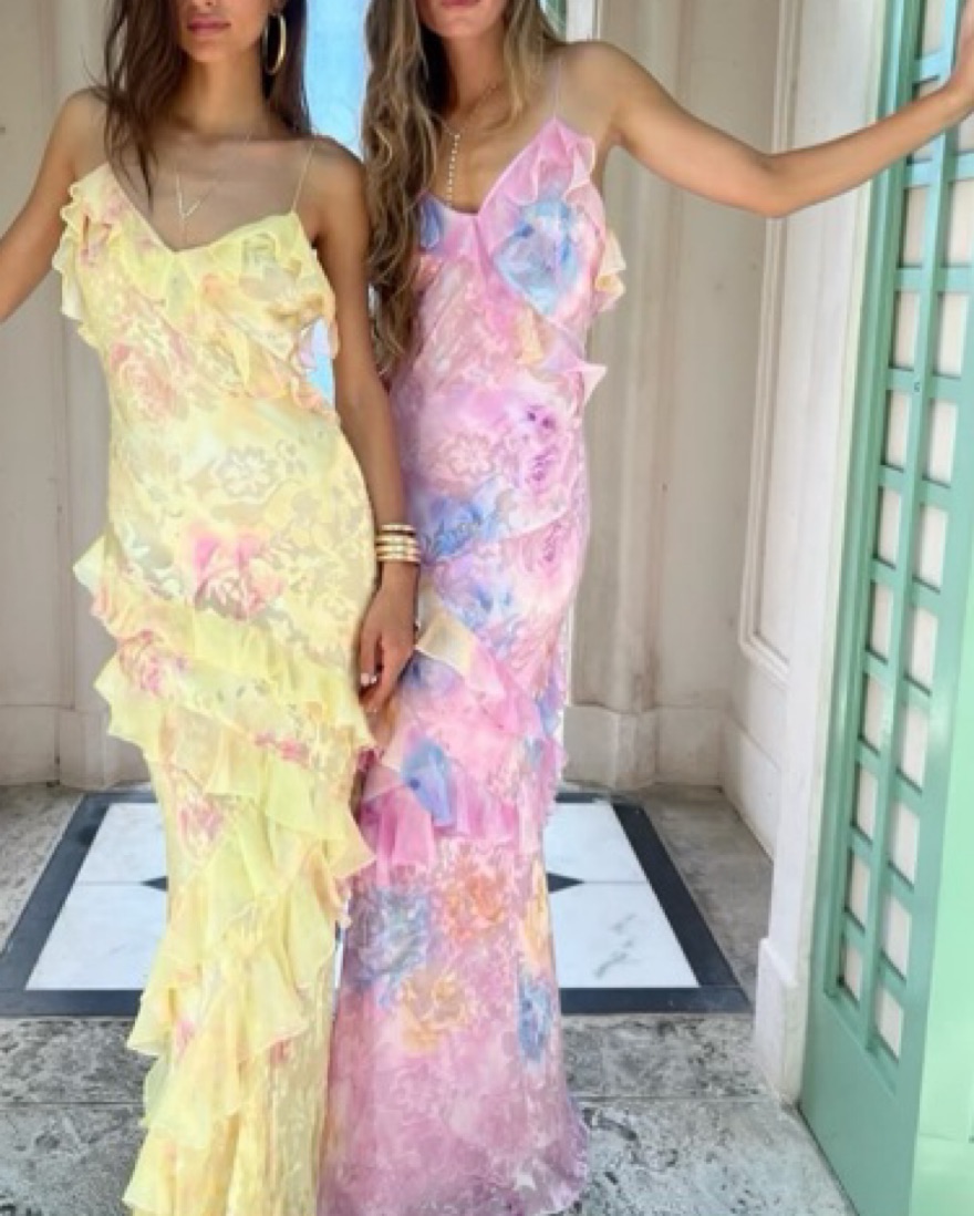 Size 0, can fit XS/0/2. Must be very careful especially with hem. Pink candy sparkle color. Crinkle burnout chiffon fabric, this maxi stuns with a vibrant floral design and overlapping, asymmetrical ruffles at the neckline that continue to descend through the skirt