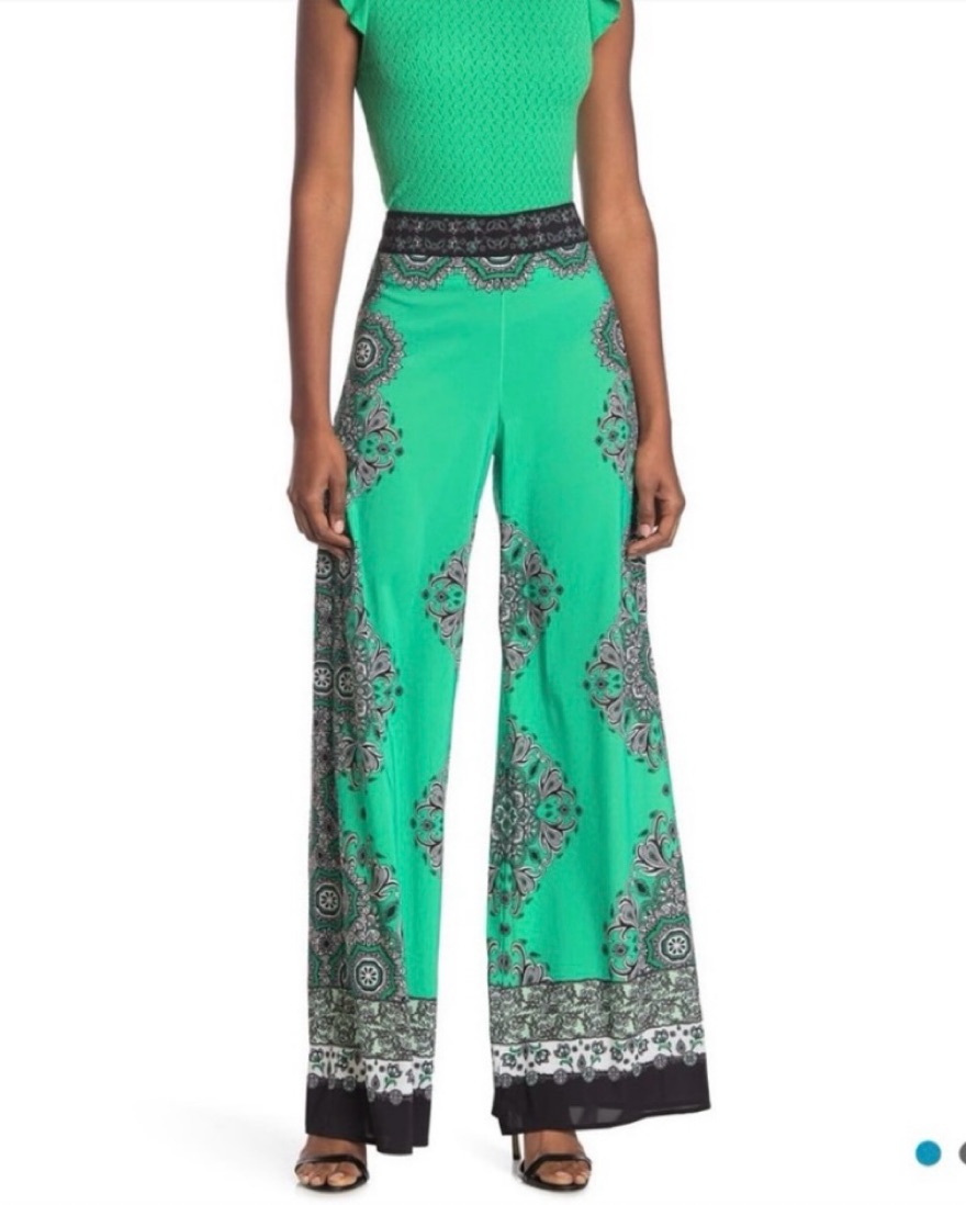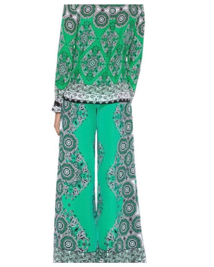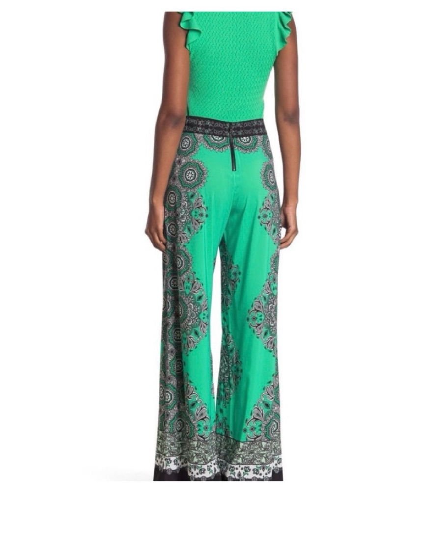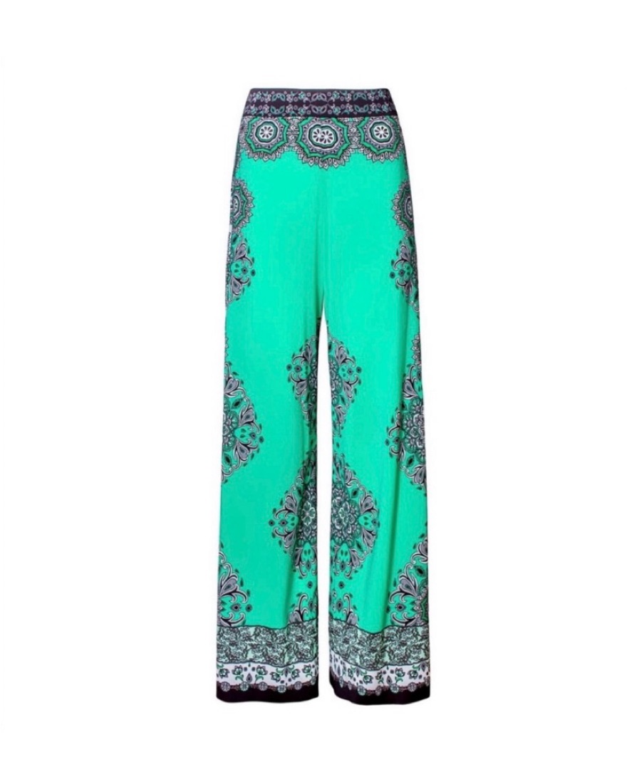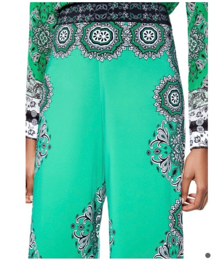 Green wide leg trousers with black a d white patterning. Light weight fabric.
