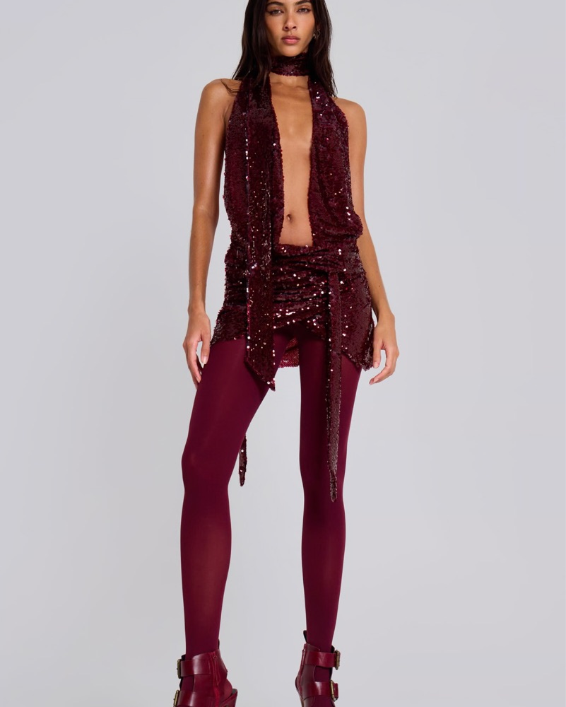 Jaded London Spyro Dress in Burgundy. Bought this for a night at E11even in Miami for a bachelorette. Perfect dress if you have a similar occasion, not your average night out. Has a removable neck scarf. Some models wear as a top or with leggings, I wore as a dress.