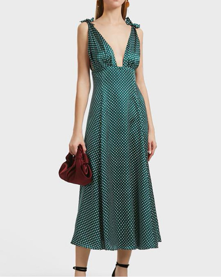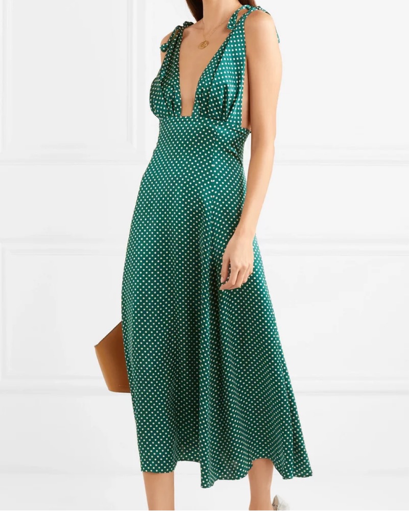 One of my favorite dresses ever— perfect for a garden party or a wedding! Green silk midi dress with micro polka dot pattern and adjustable ties on the shoulder. Size XS.
