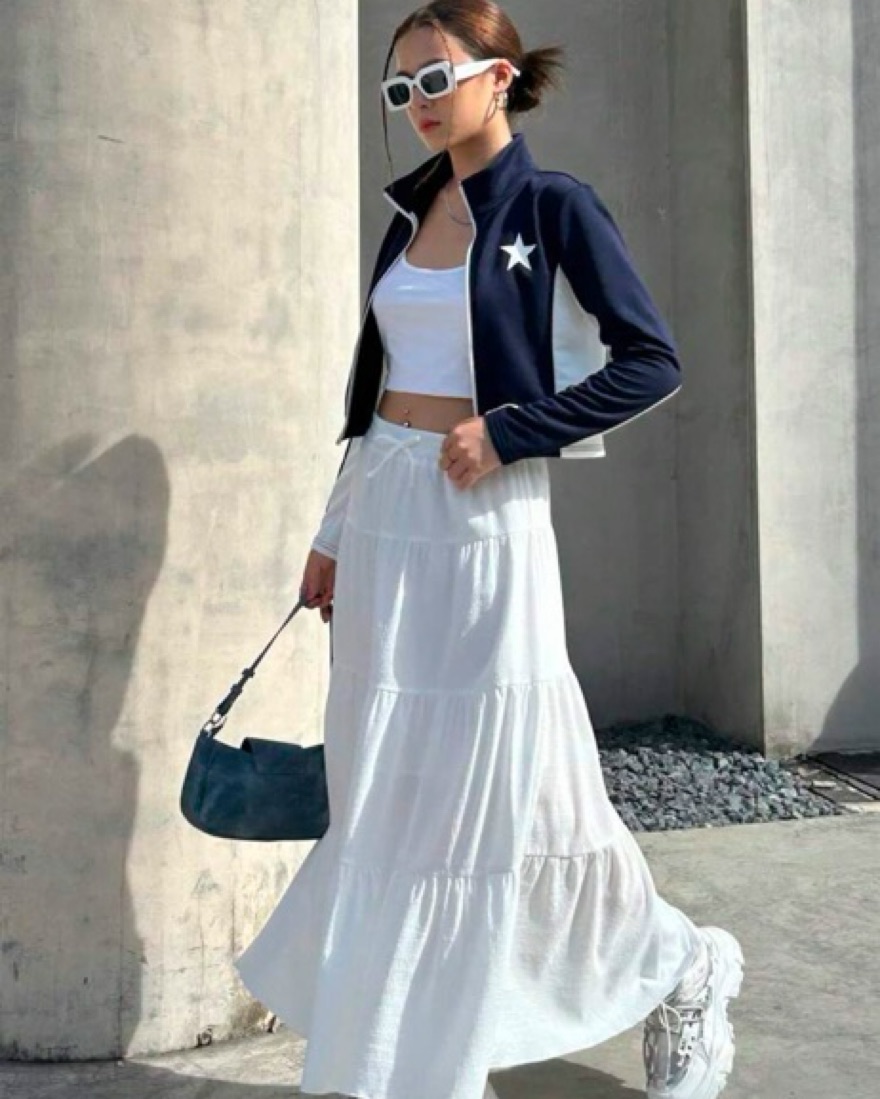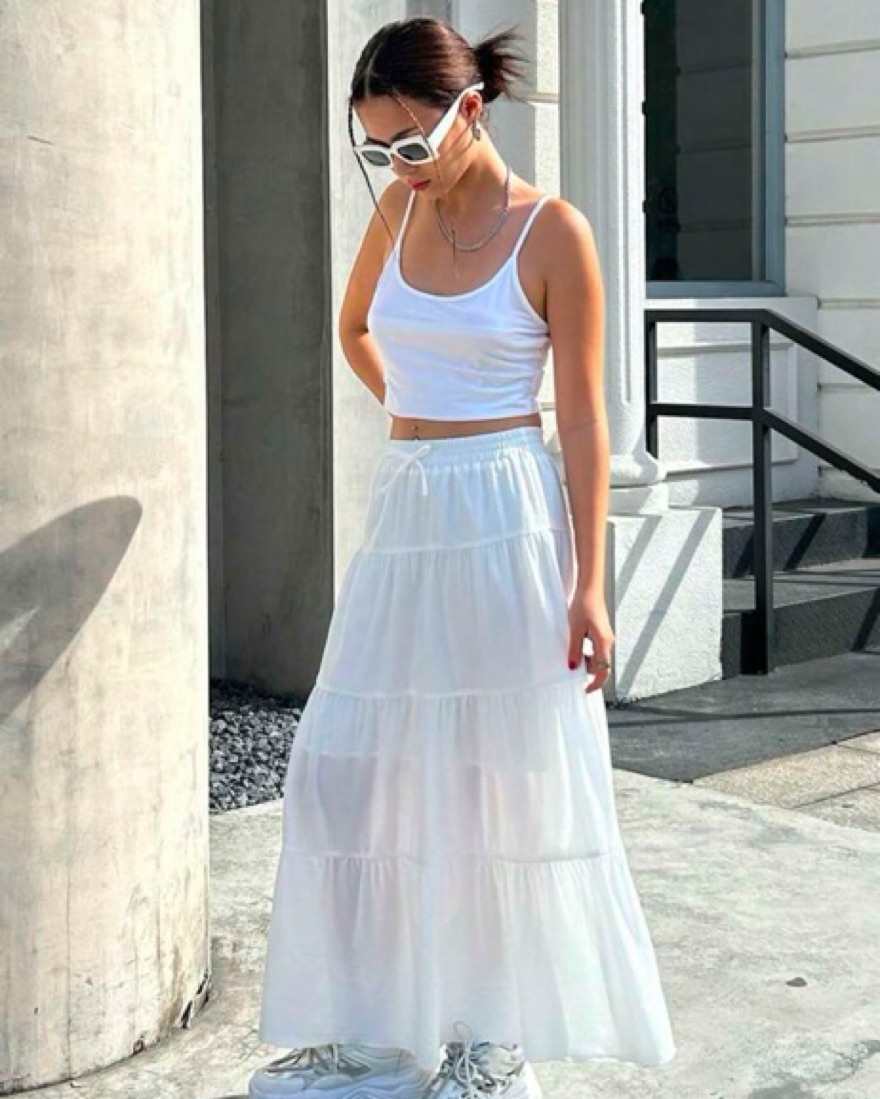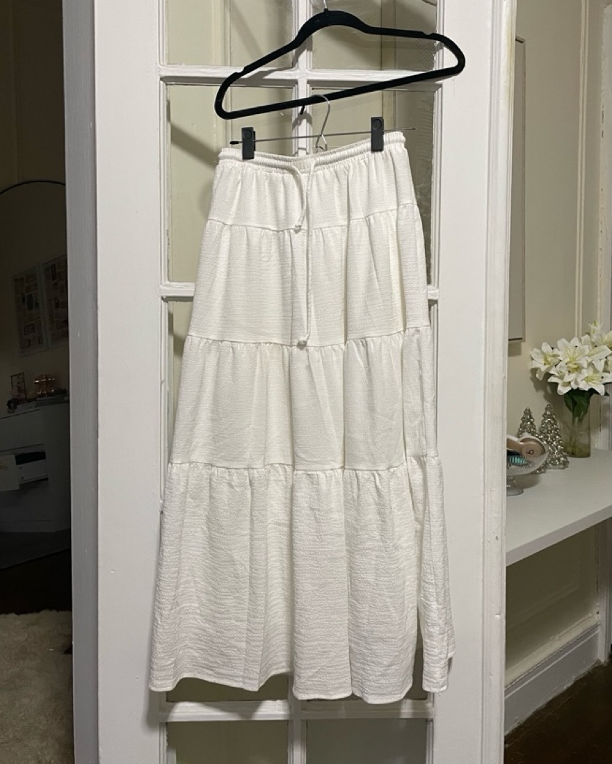 This whimsical white maxi skirt is perfect for a summer soirée or warm-weather wedding. The flowing tiered design and airy fabric create a dreamy, feminine look.